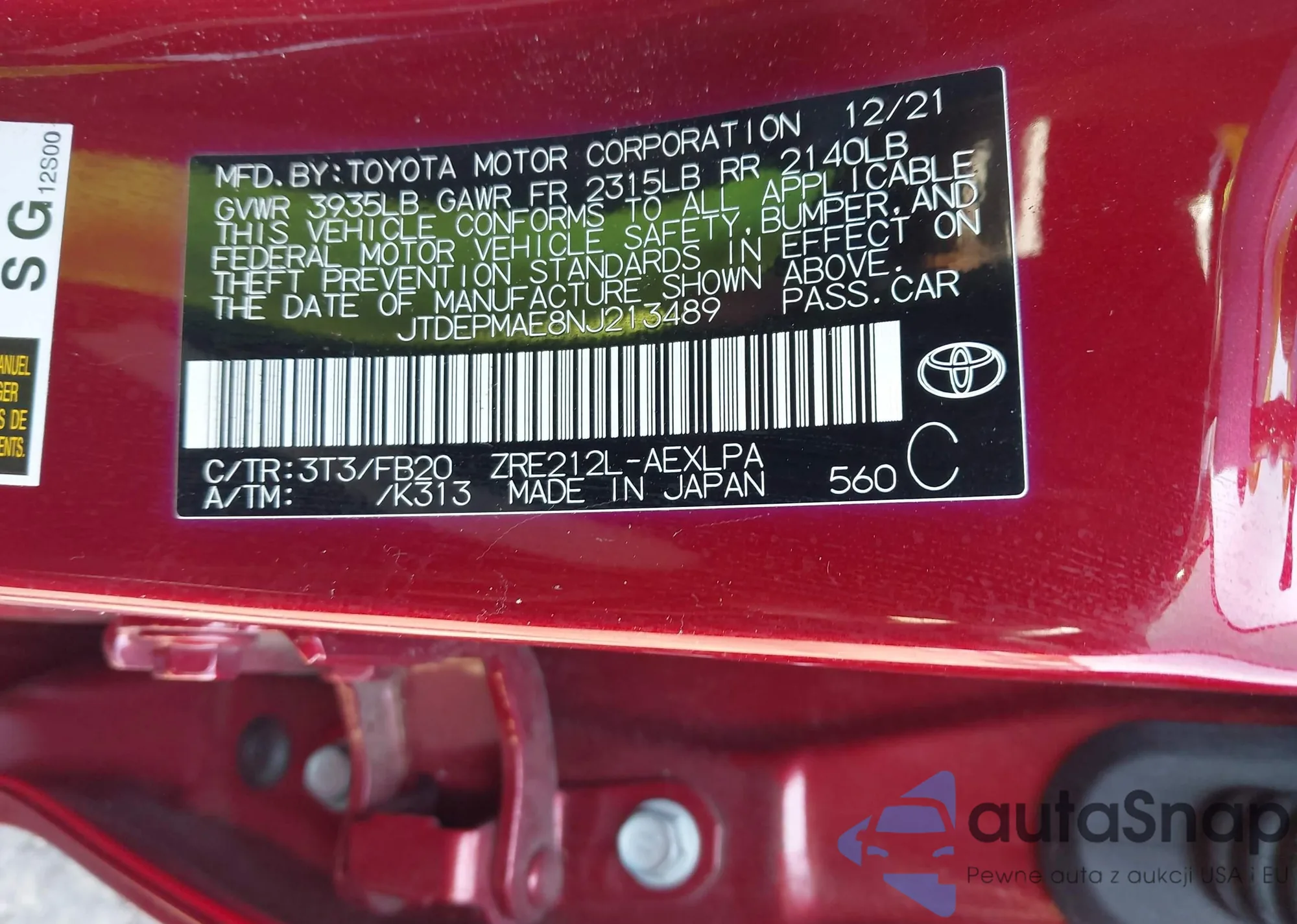 LOT: 43207697 VIN: JTDEPMAE8NJ213489