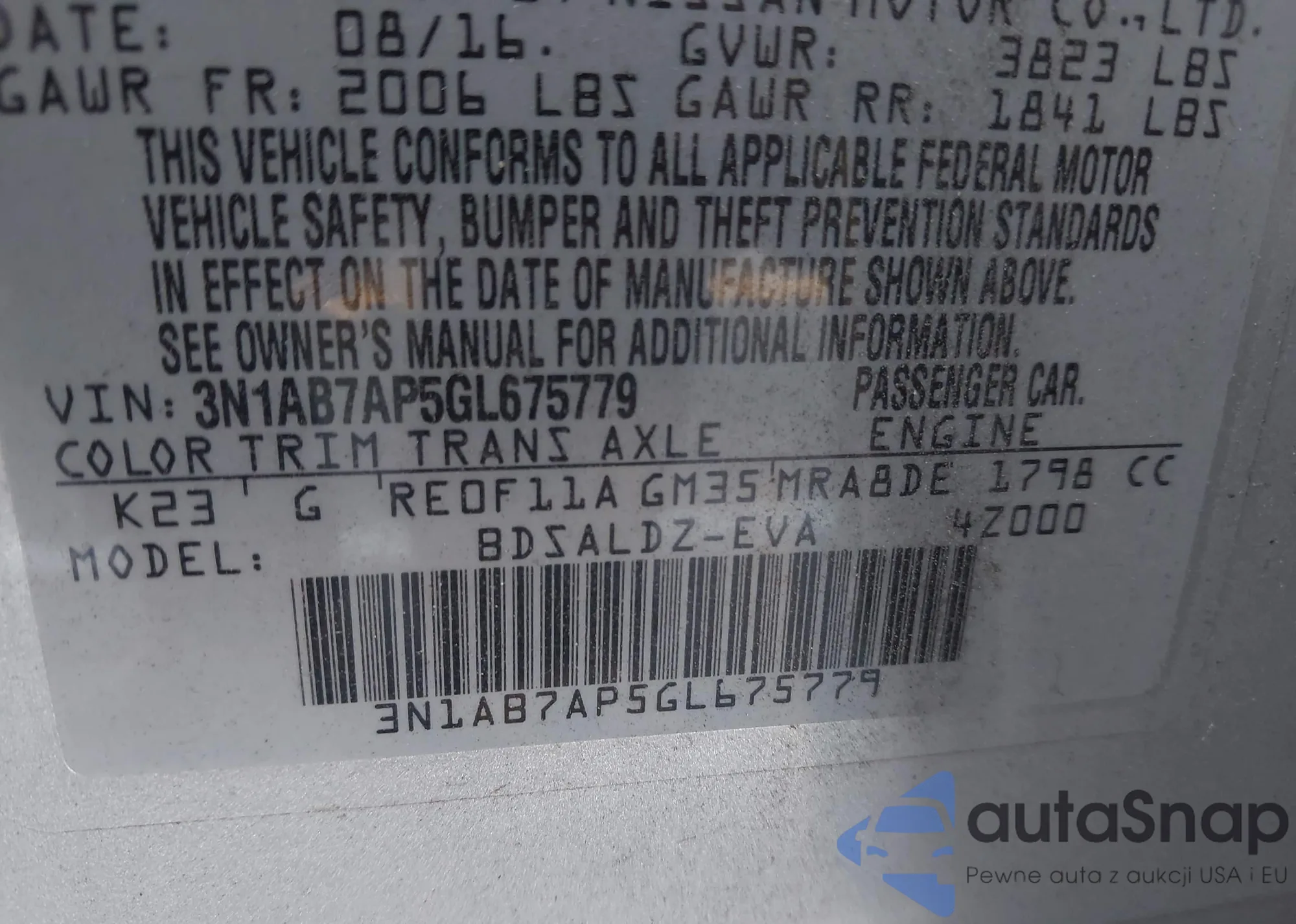 LOT: 43626670 VIN: 3N1AB7AP5GL675779