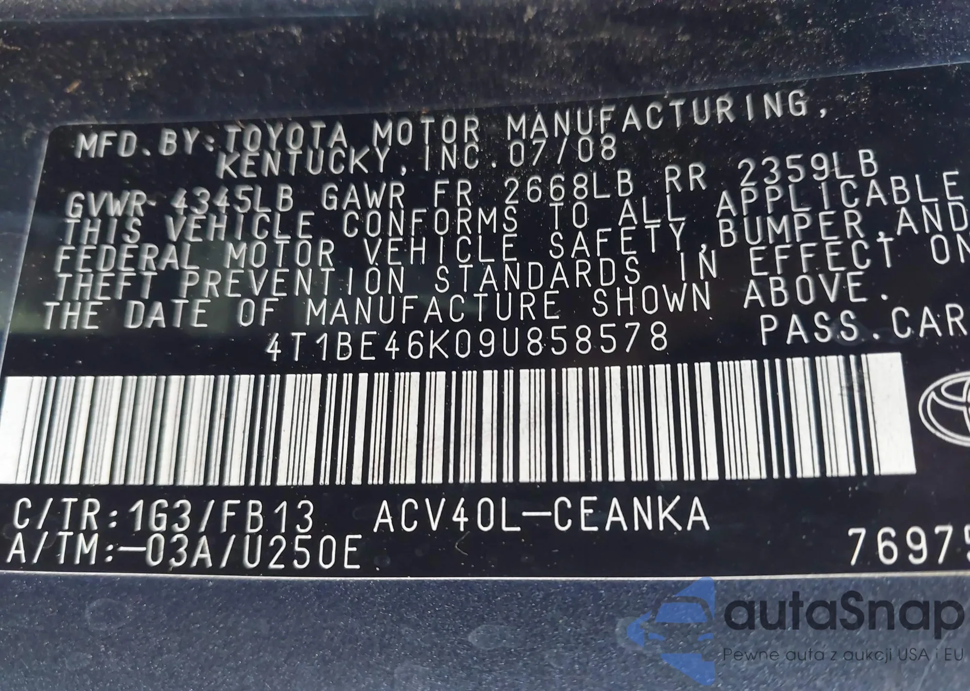 • VIN 4T1BE46K09U858578