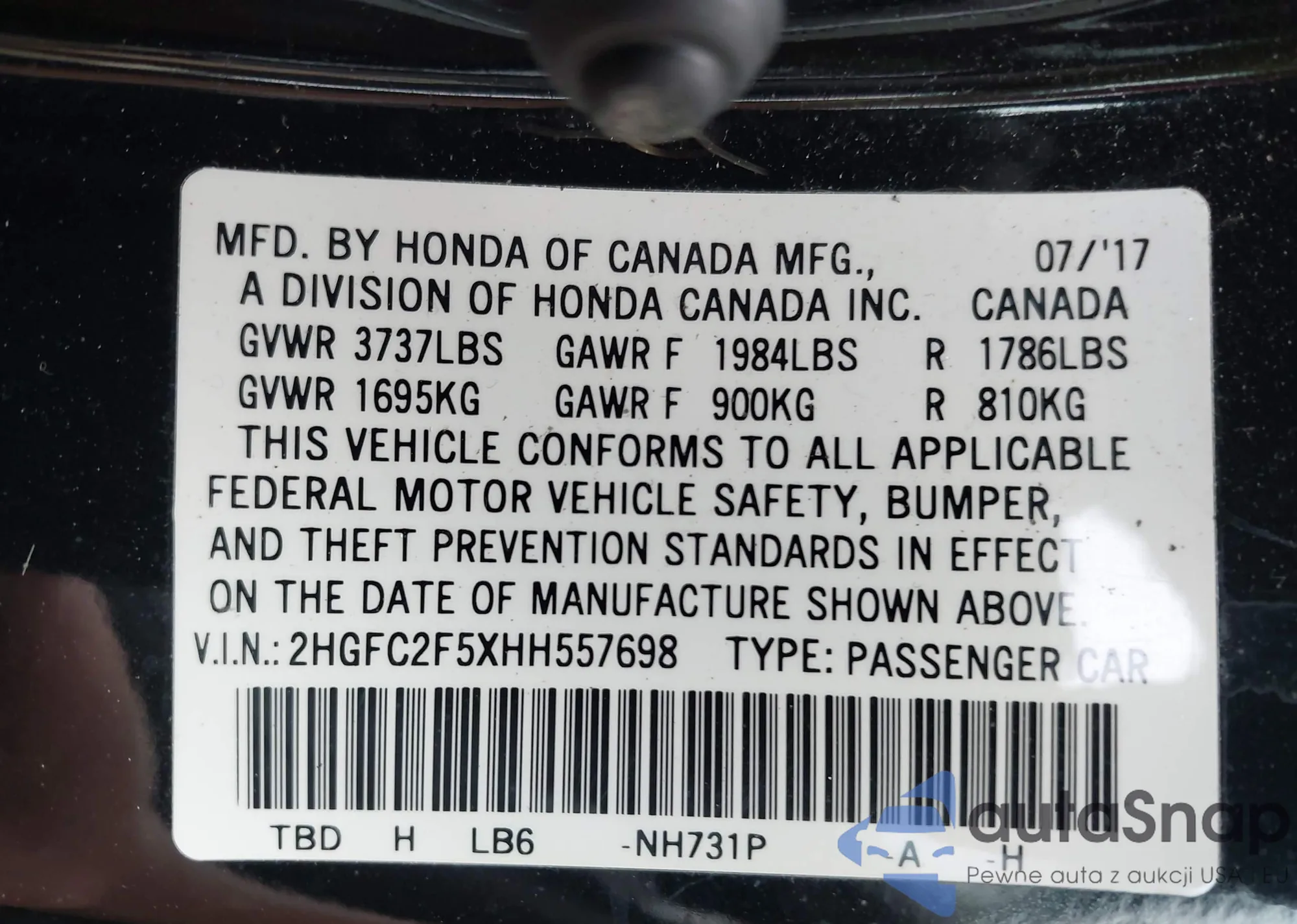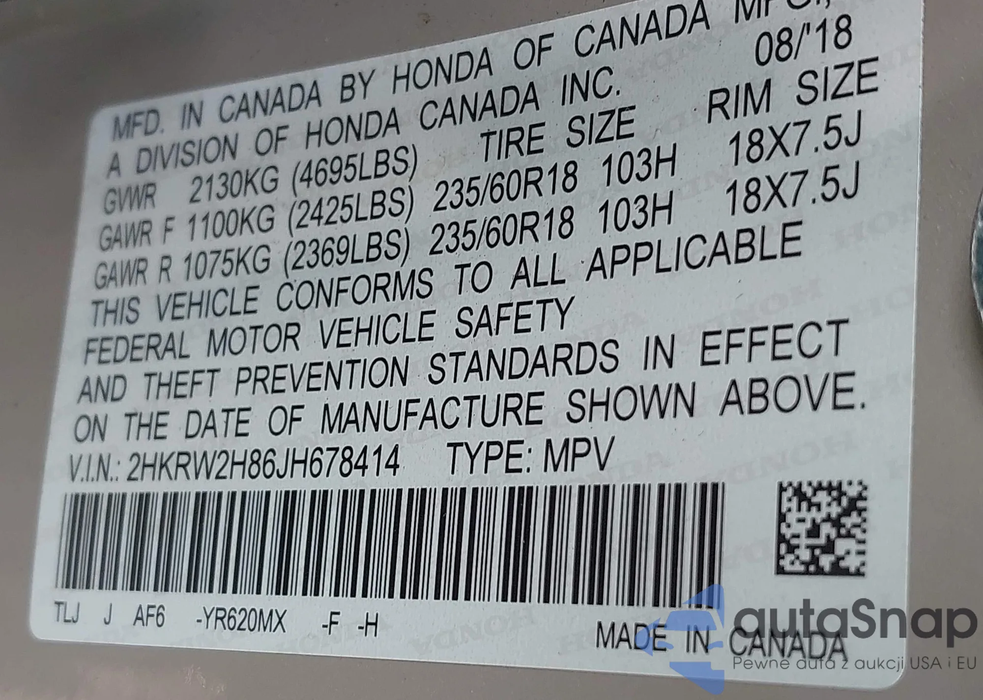• VIN 2HKRW2H86JH678414