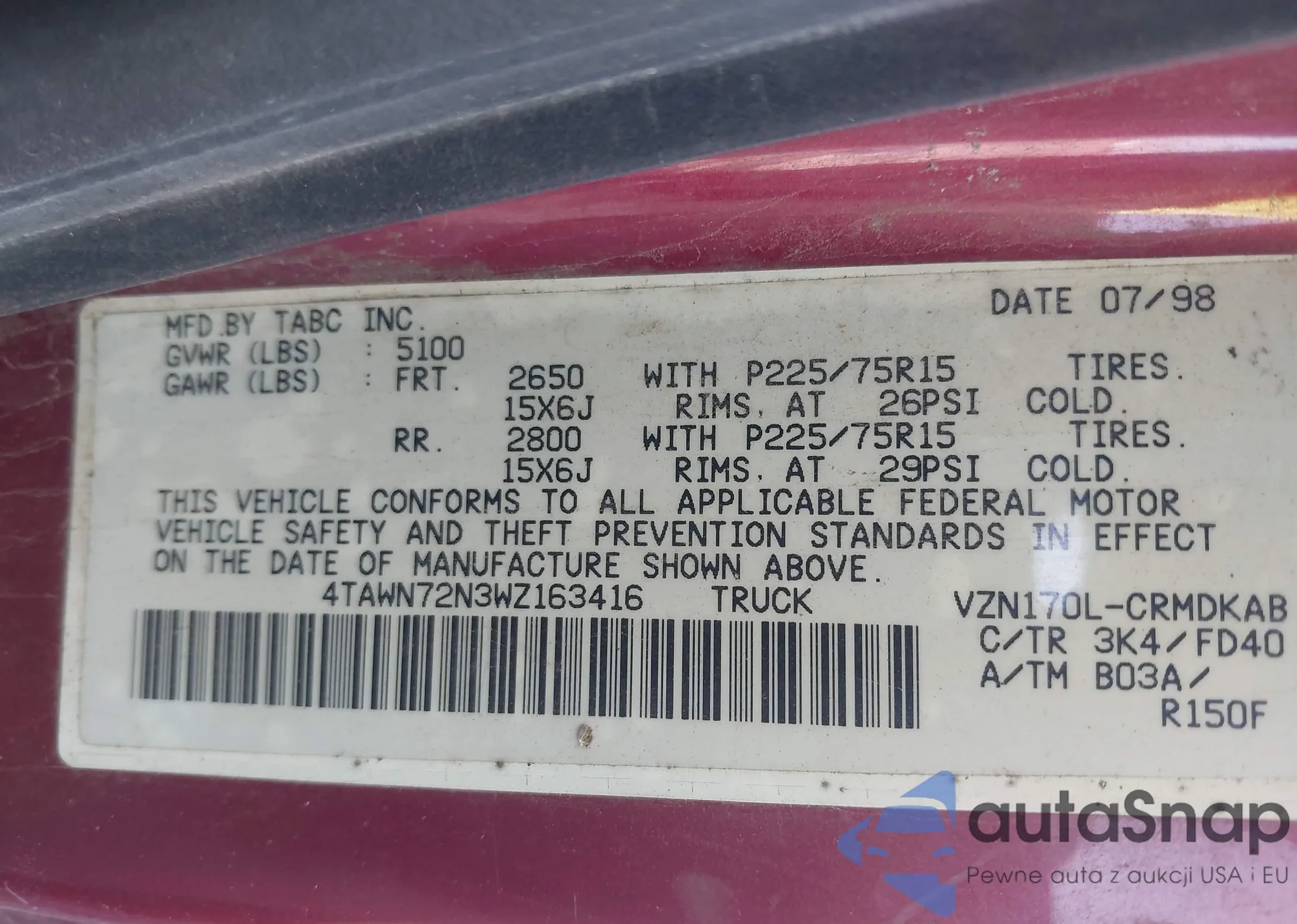 • VIN 4TAWN72N3WZ163416