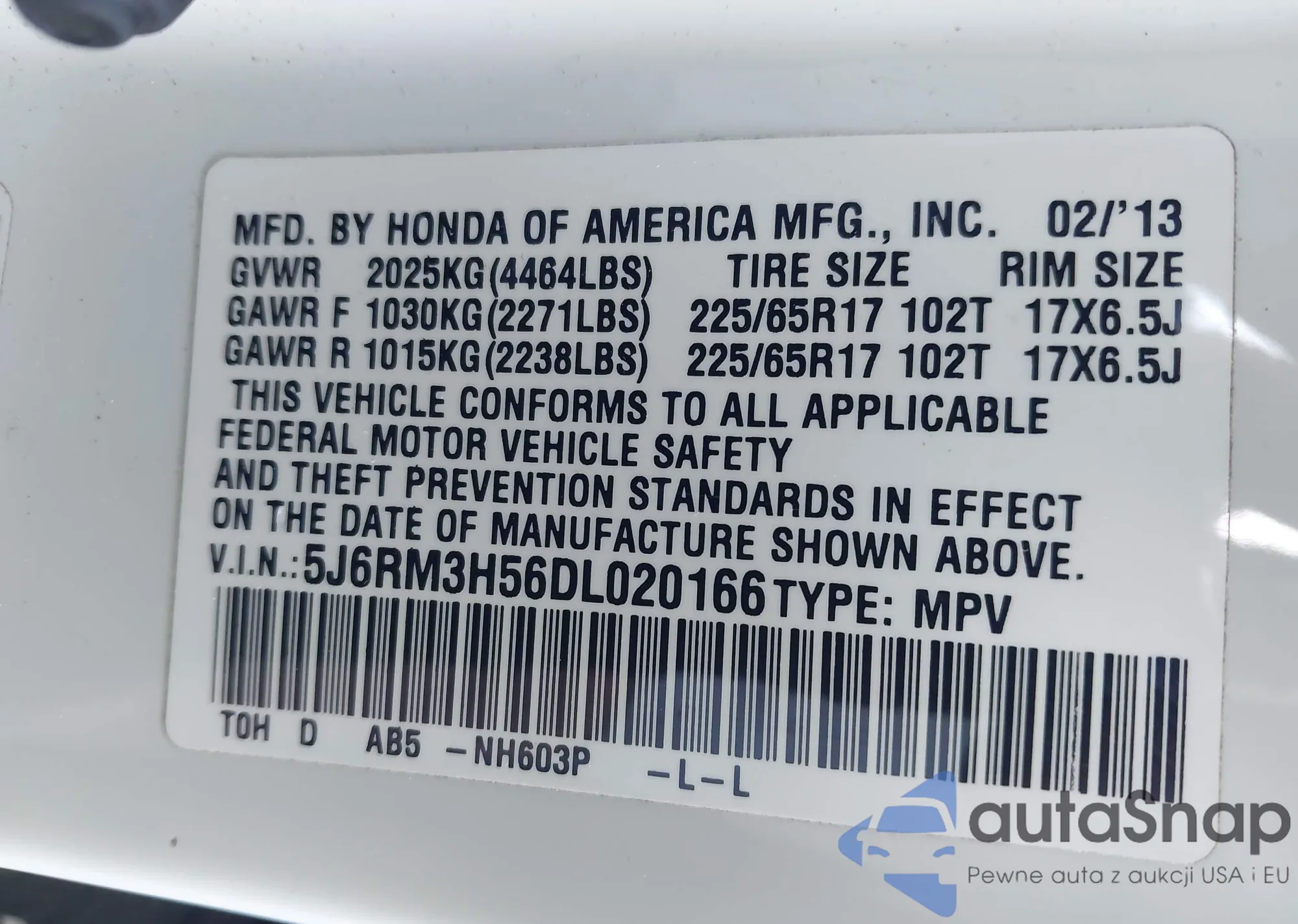 • VIN 5J6RM3H56DL020166