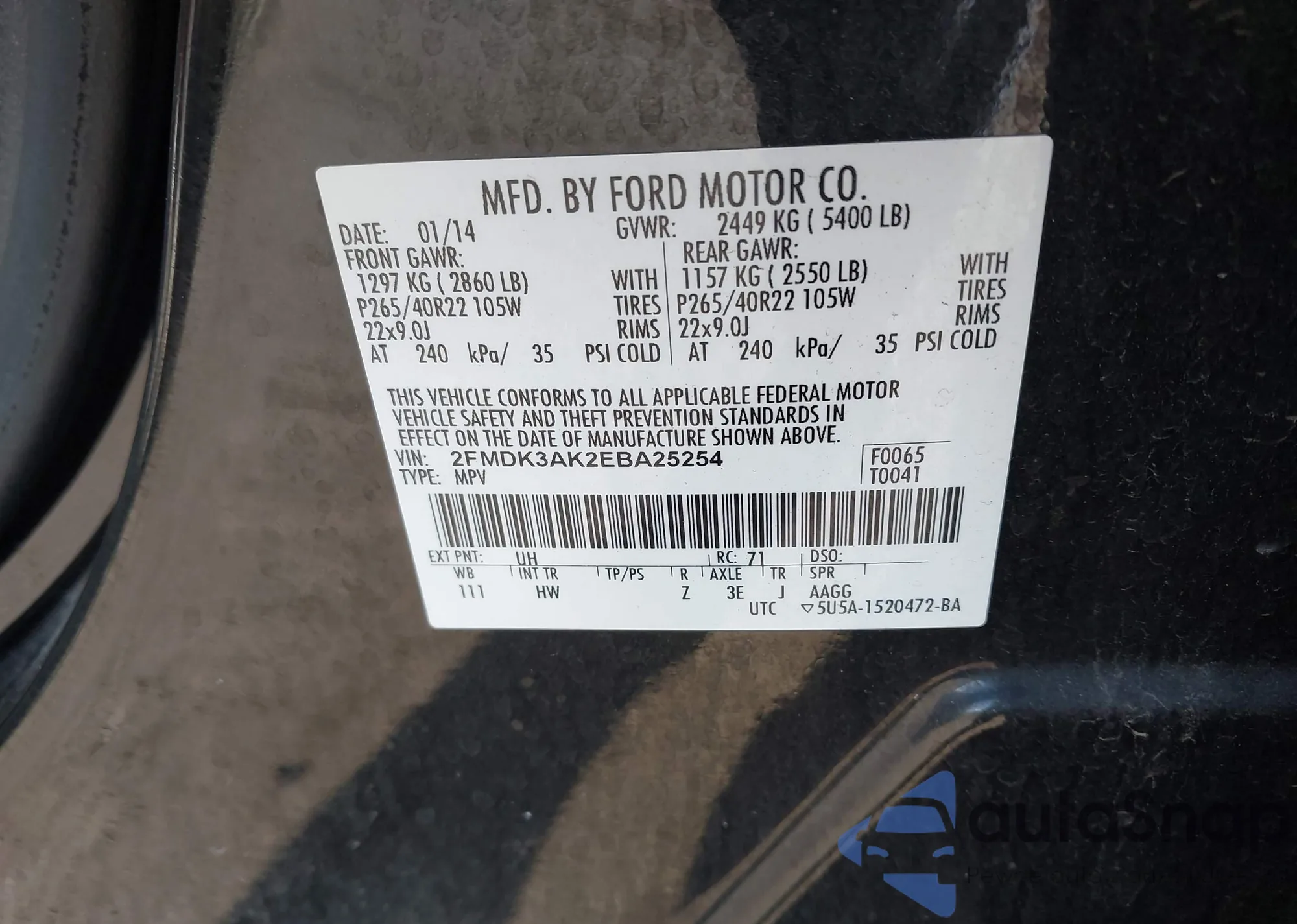 • VIN 2FMDK3AK2EBA25254