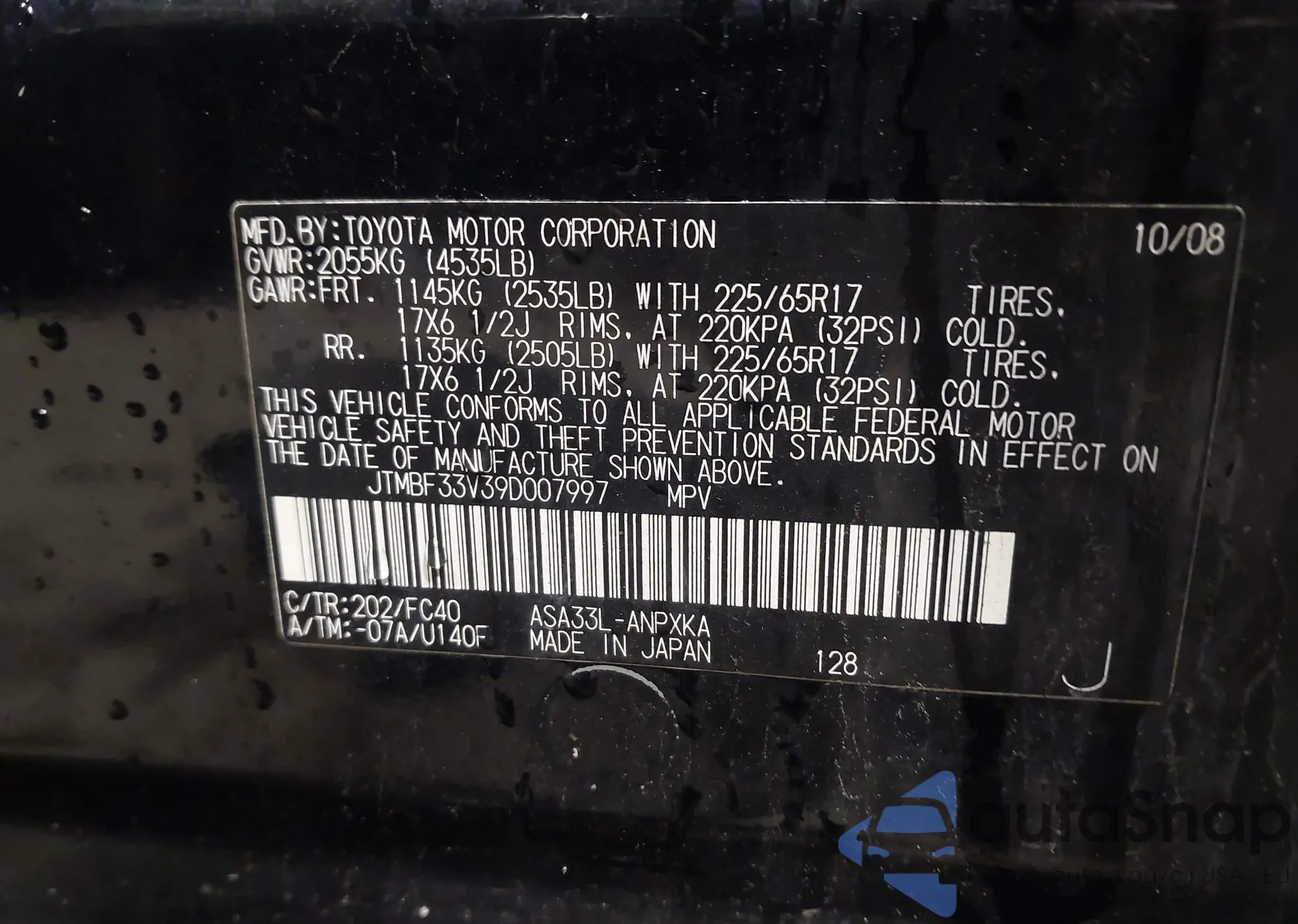 LOT: 43973861 VIN: JTMBF33V39D007997