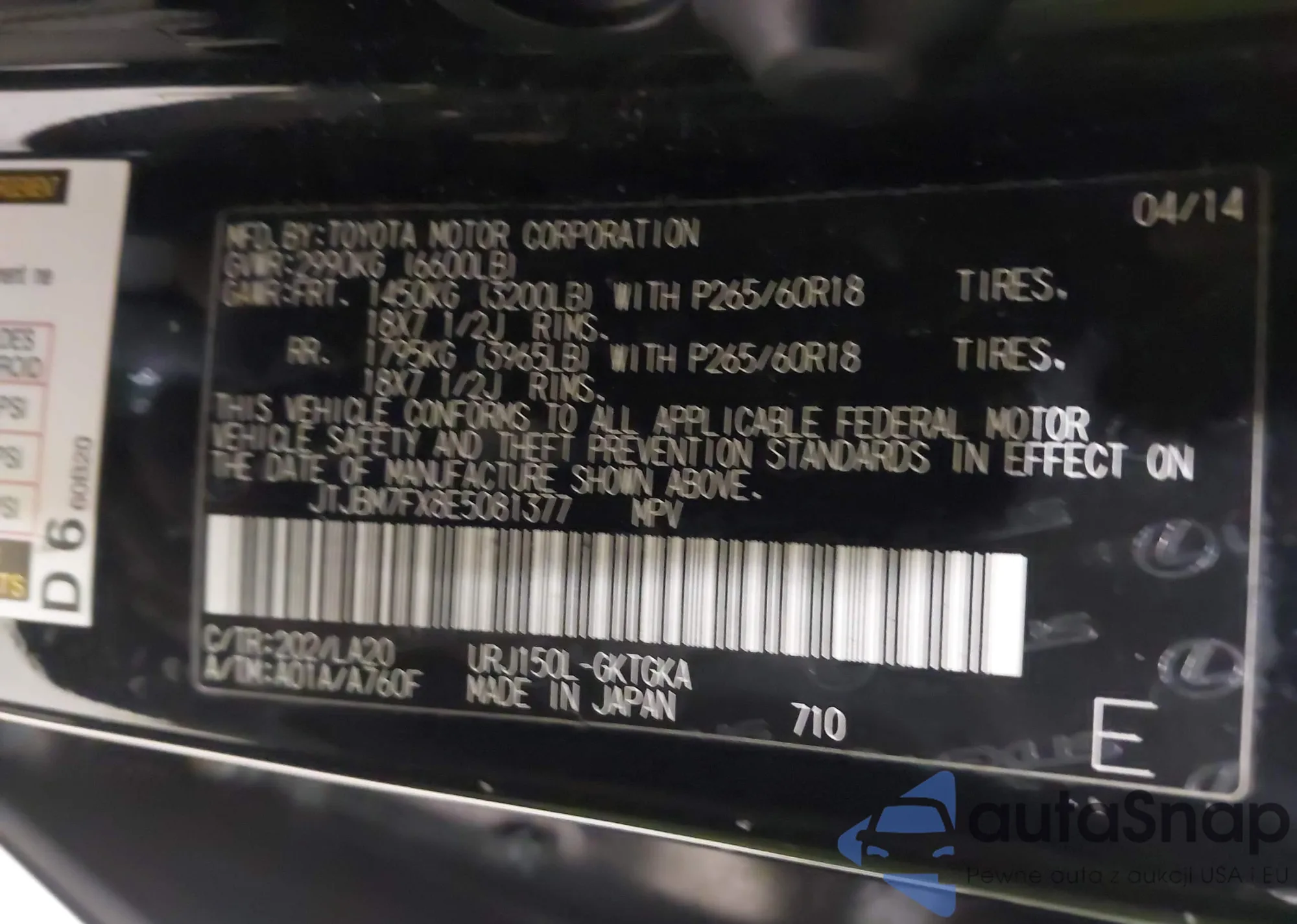 LOT: 43984916 VIN: JTJBM7FX8E5081377