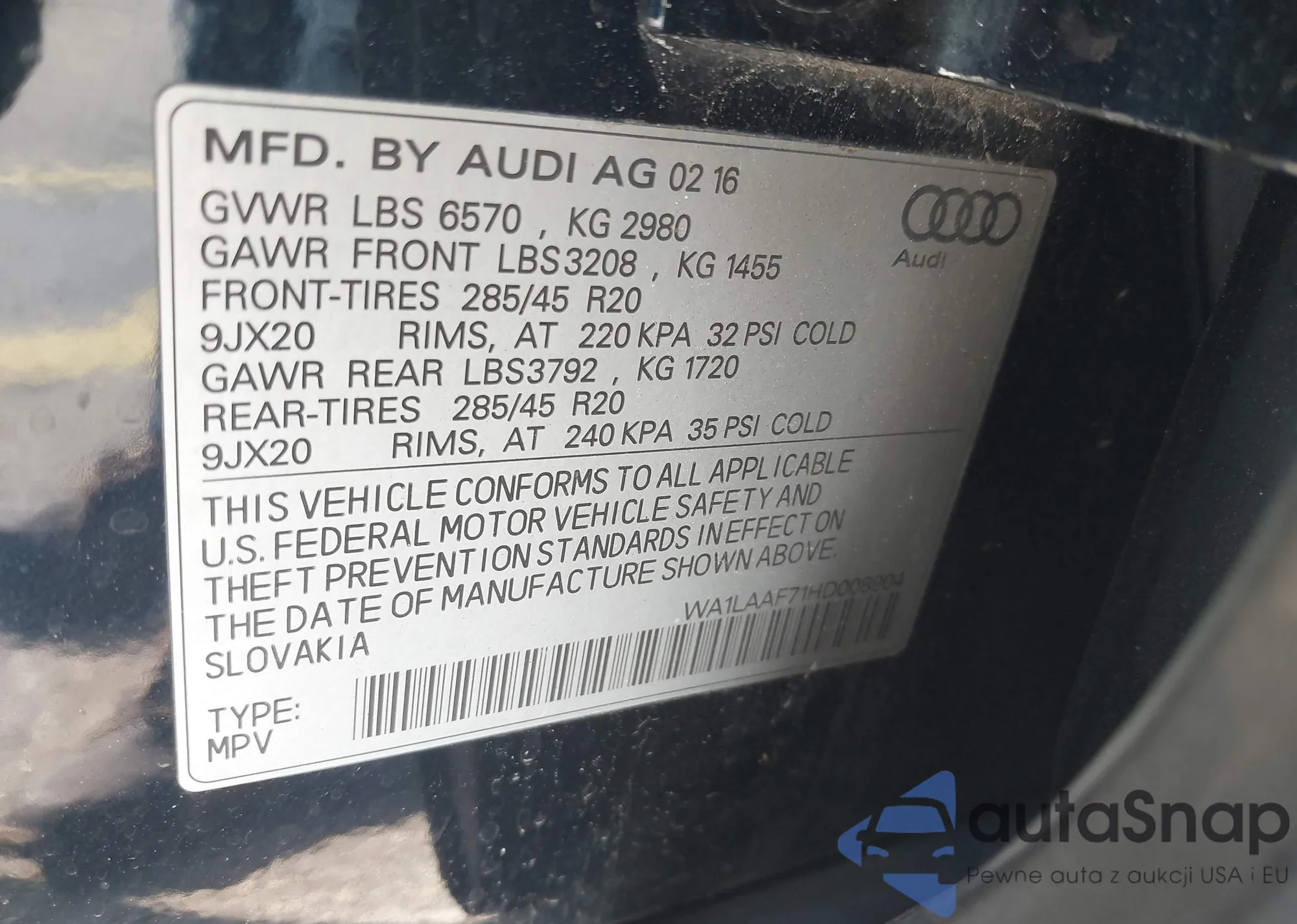 LOT: 43769759 VIN: WA1LAAF71HD008904