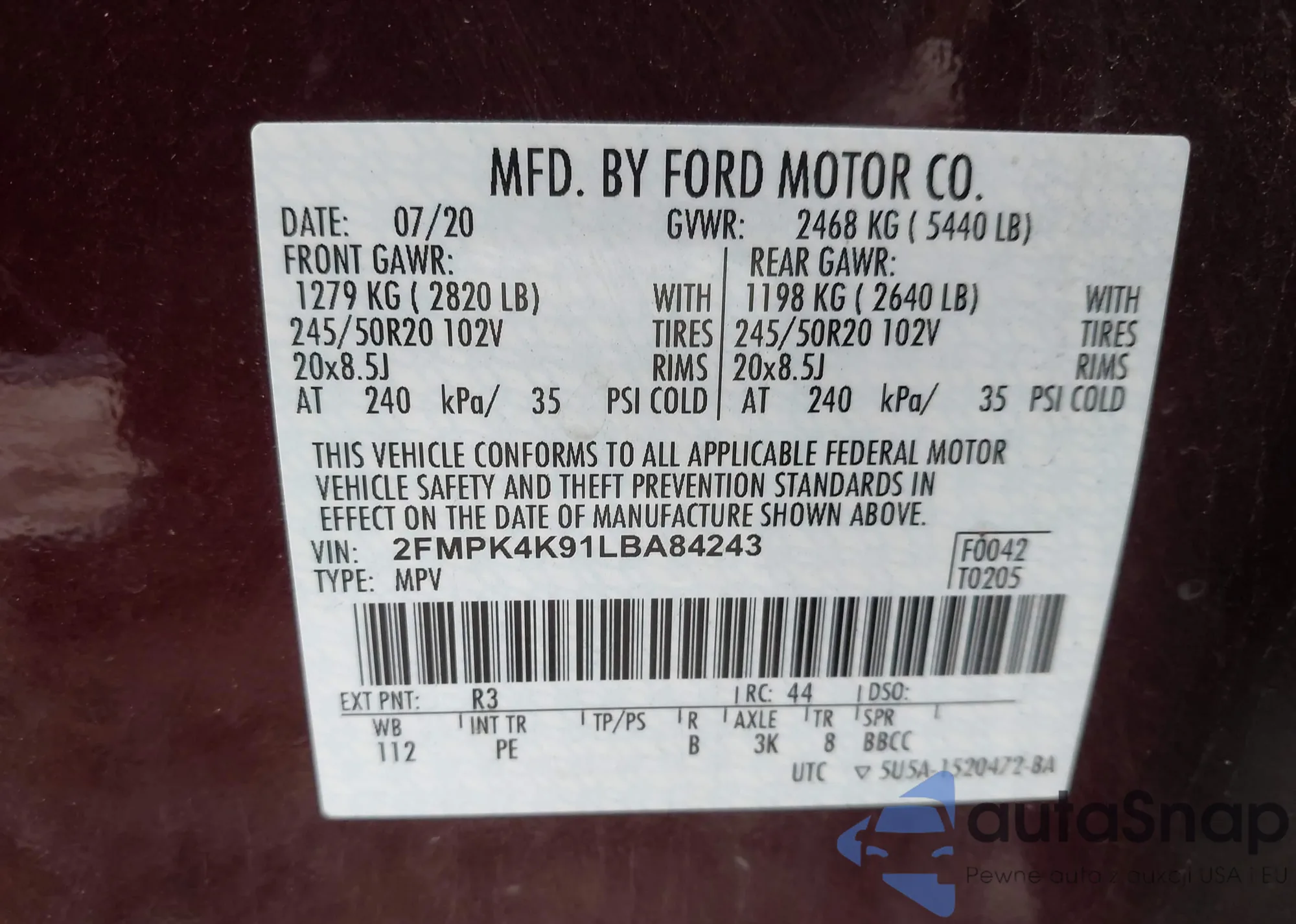 • VIN 2FMPK4K91LBA84243