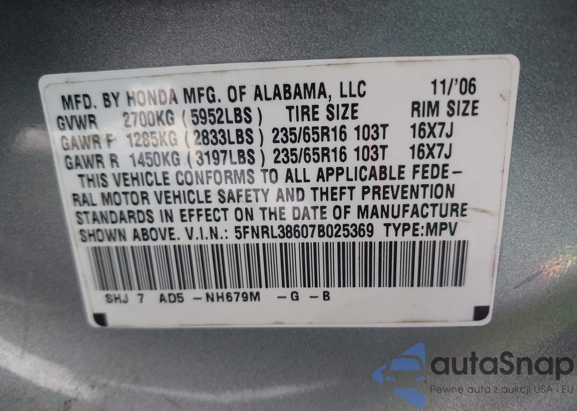 • VIN 5FNRL38607B025369