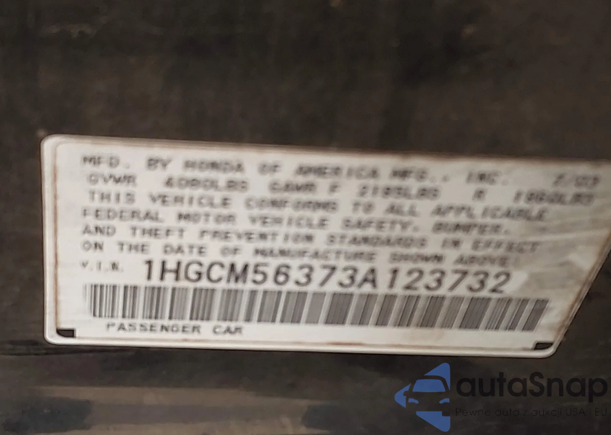 LOT: 43912300 VIN: 1HGCM56373A123732