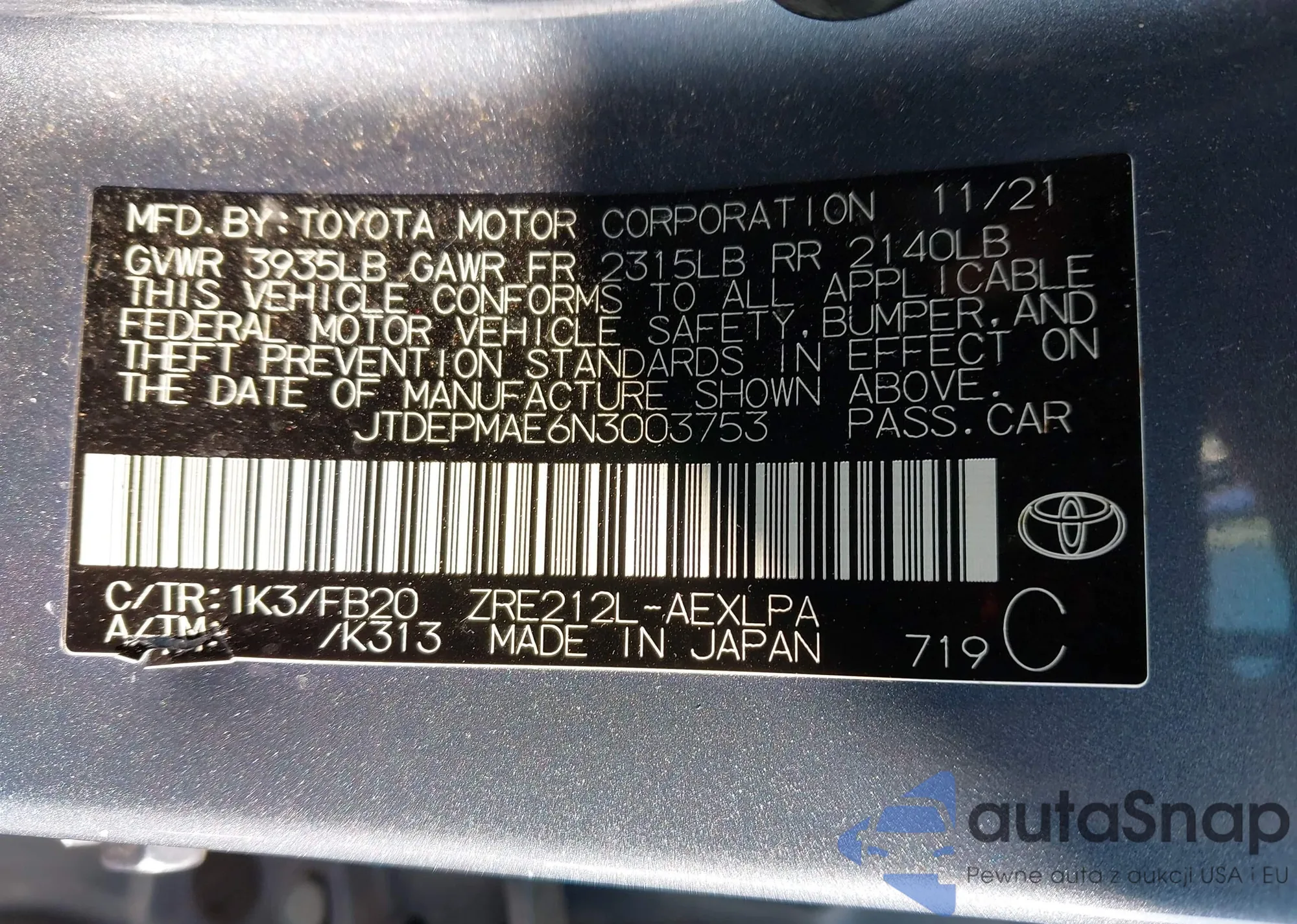 LOT: 43971562 VIN: JTDEPMAE6N3003753