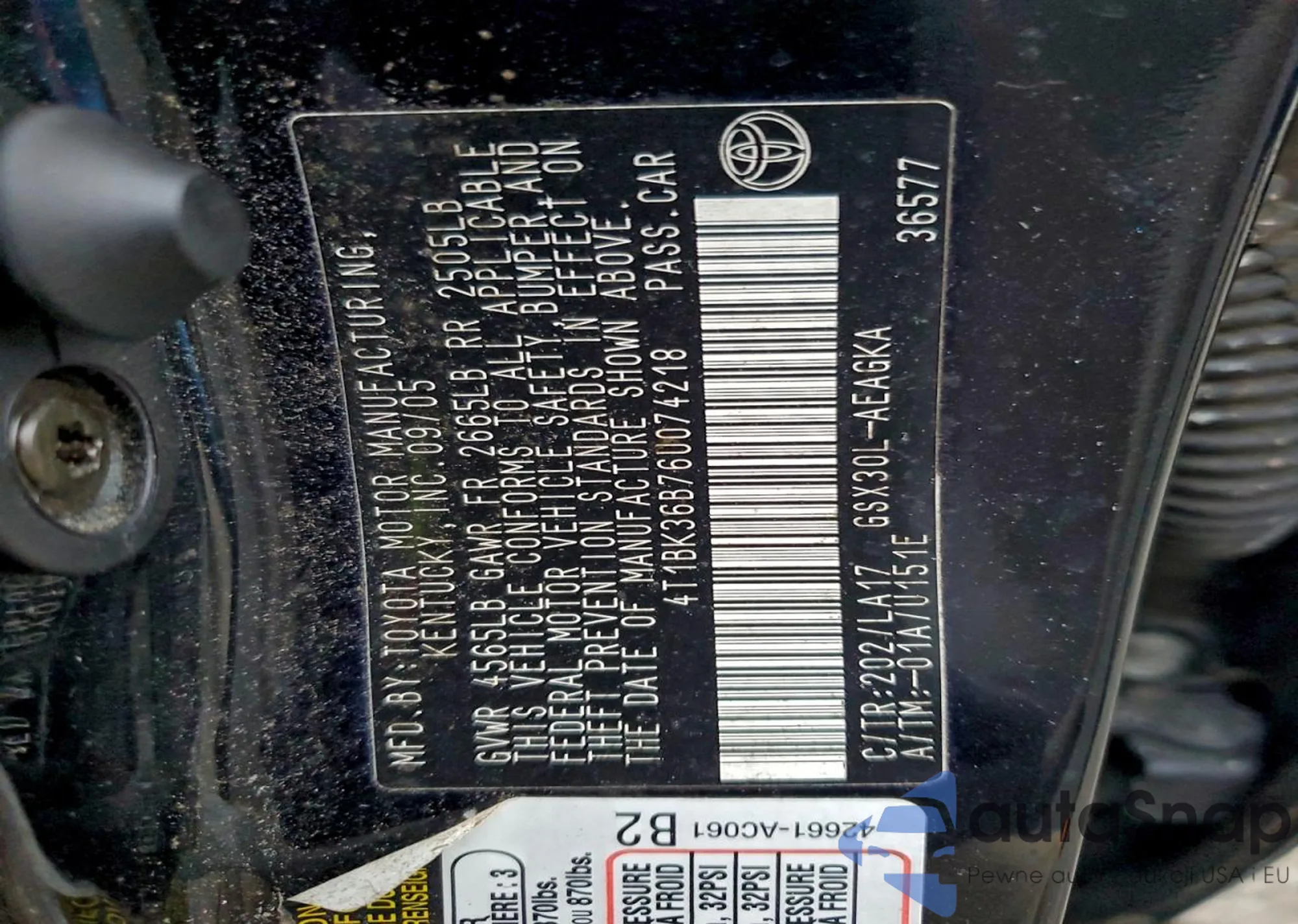 LOT: 94736035 VIN: 4T1BK36B76U074218