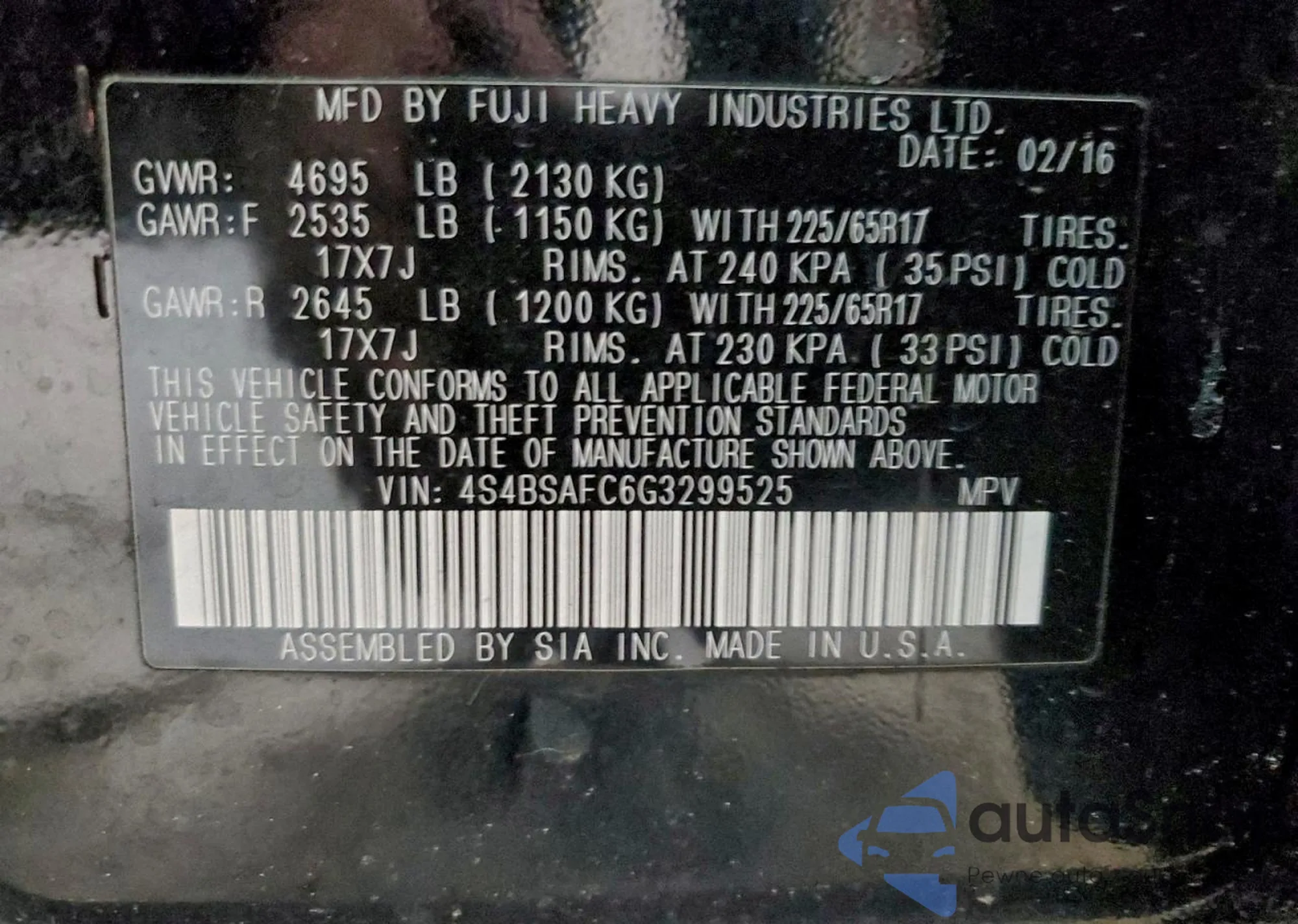 • VIN 4S4BSAFC6G3299525