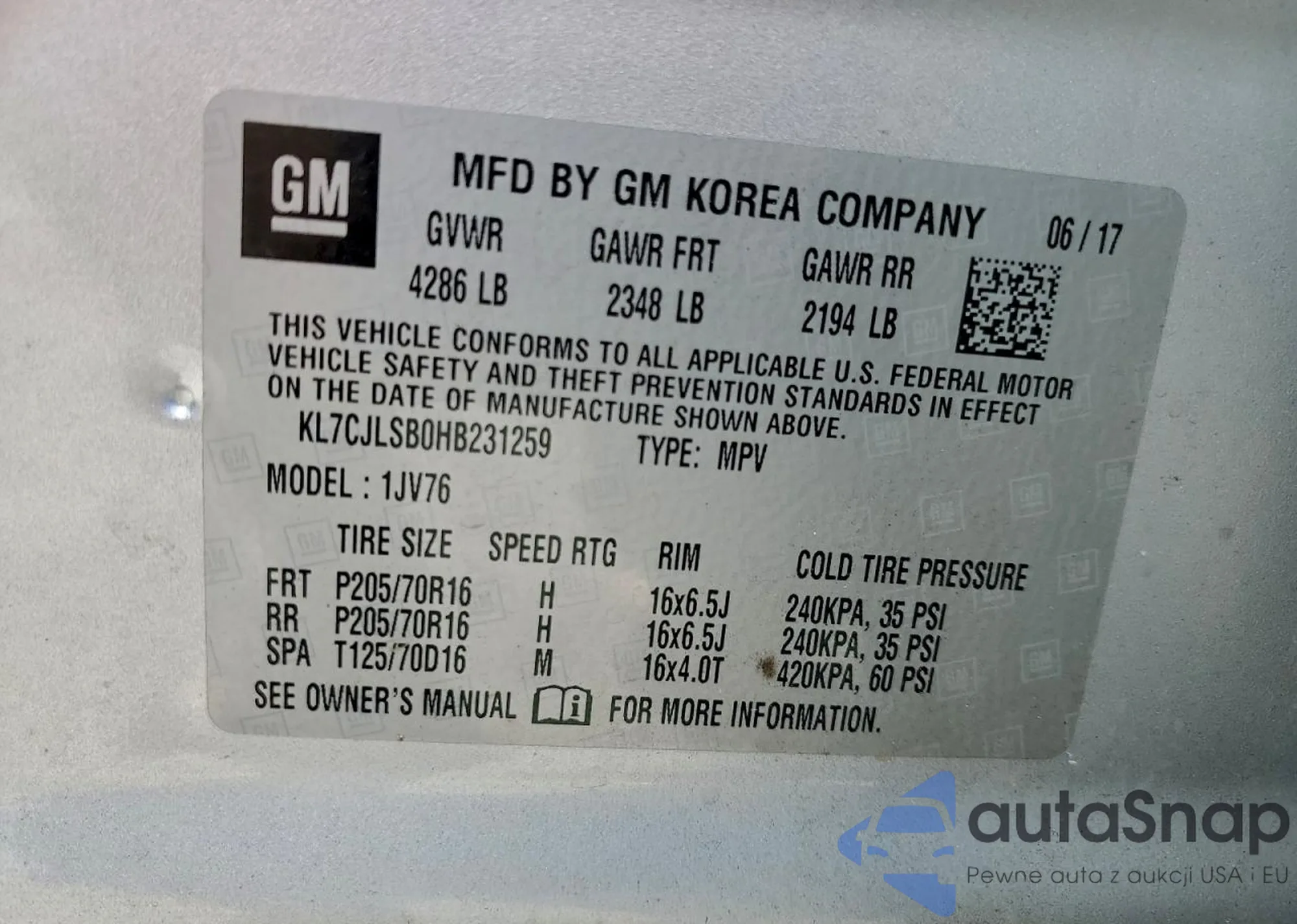 • VIN KL7CJLSB0HB231259