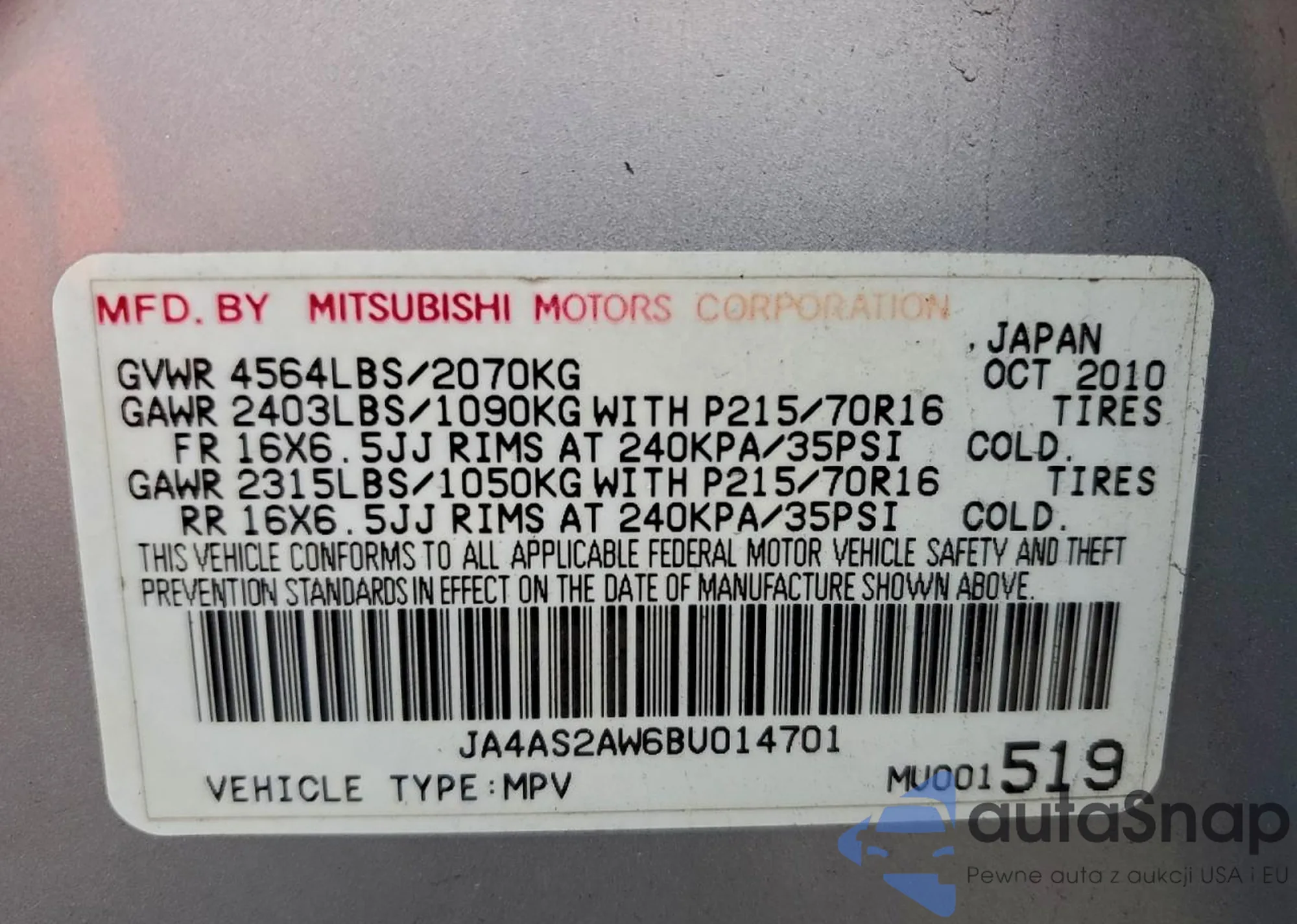 • VIN JA4AS2AW6BU014701