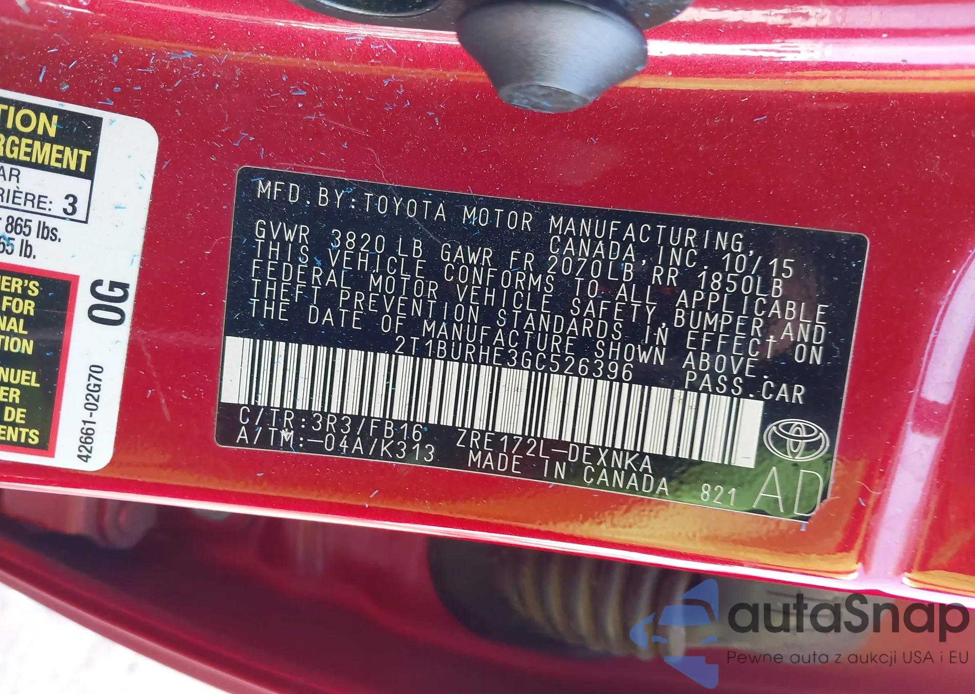 LOT: 43803720 VIN: 2T1BURHE3GC526396