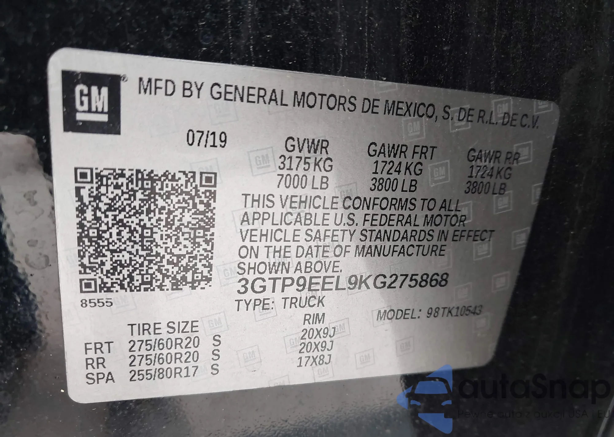 • VIN 3GTP9EEL9KG275868