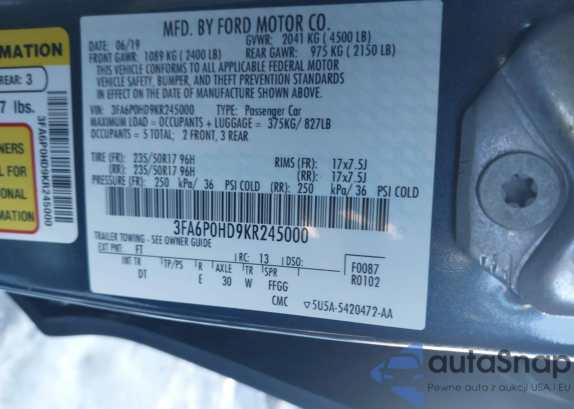 LOT: 43961751 VIN: 3FA6P0HD9KR245000