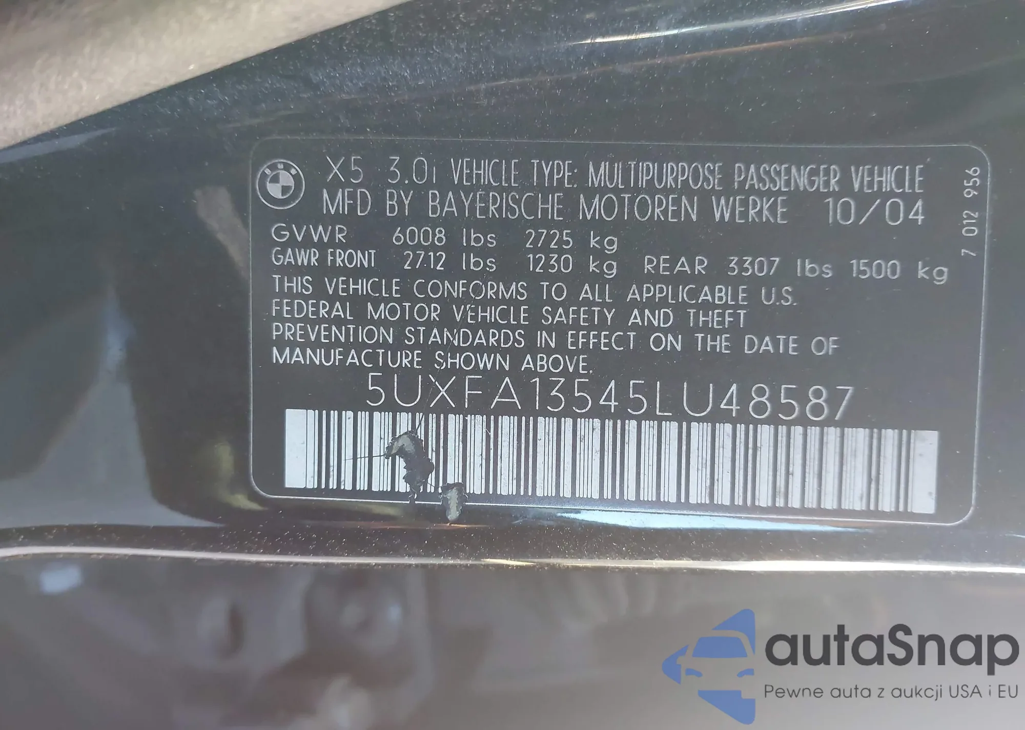 2005 BMW X5 3.0I z USA, uszkodzony, nr VIN 5UXFA13545LU48587