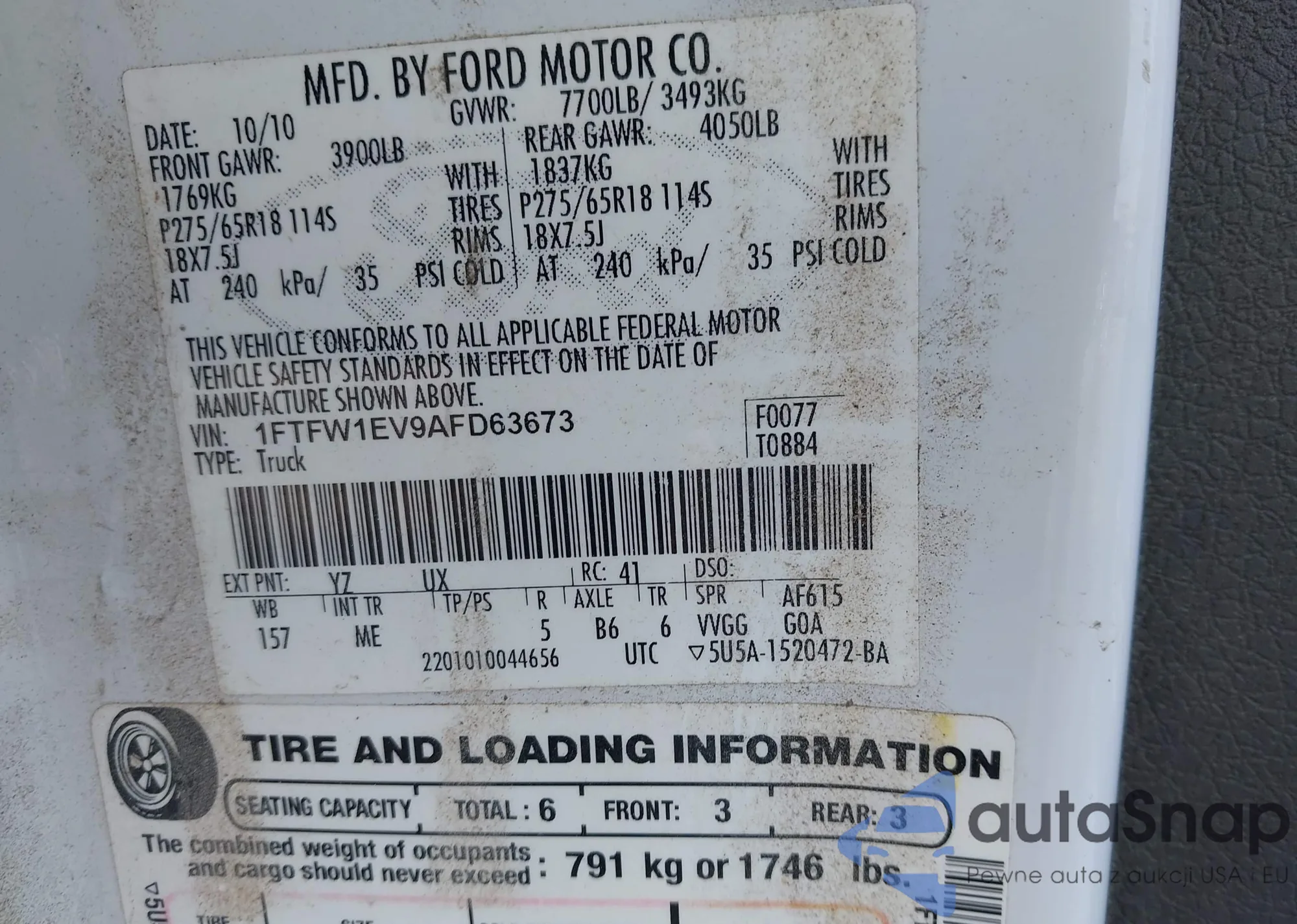 LOT: 43972221 VIN: 1FTFW1EV9AFD63673