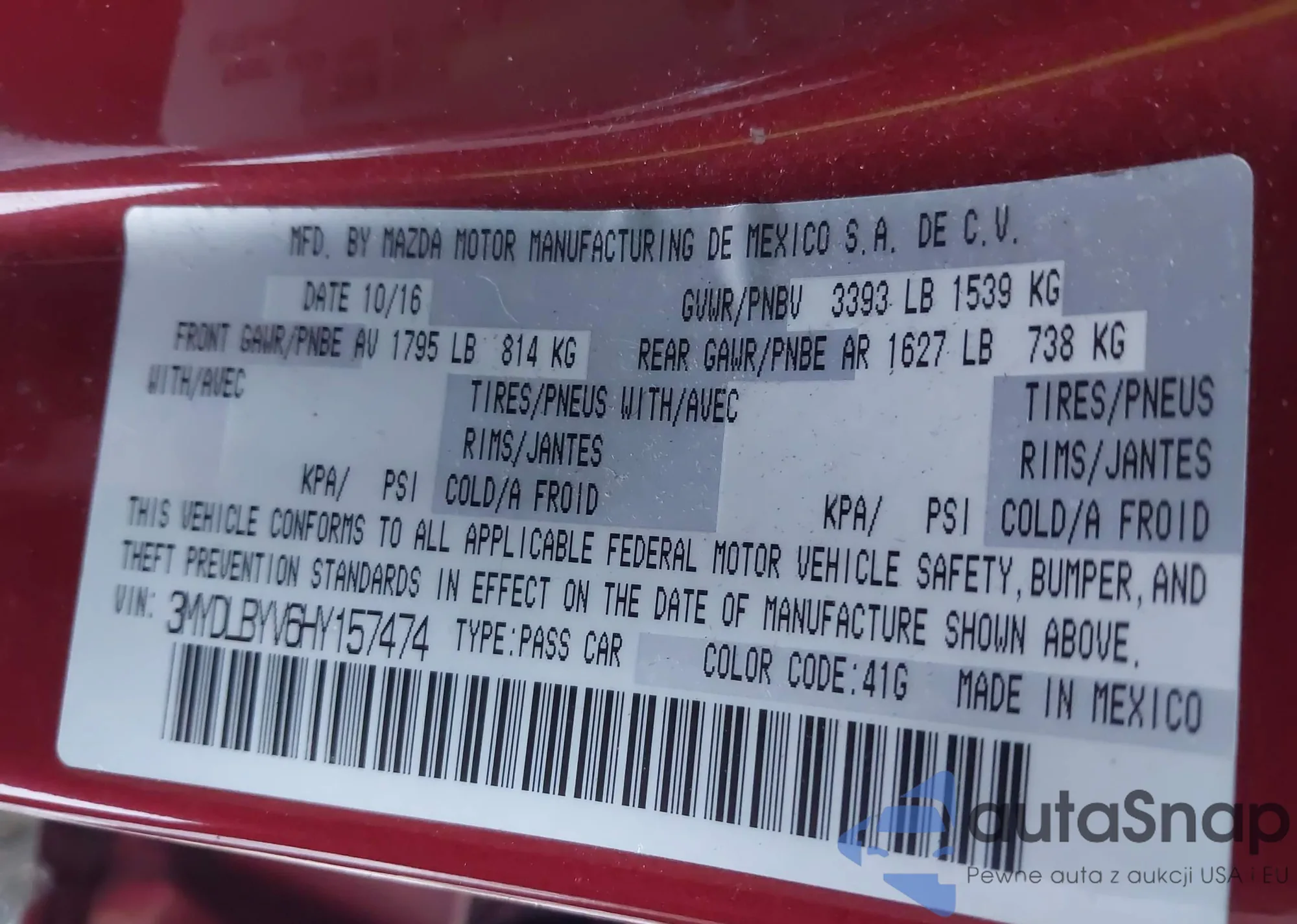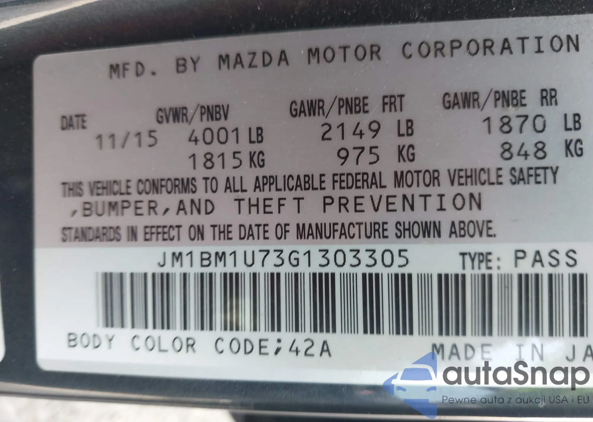 LOT: 43991733 VIN: JM1BM1U73G1303305