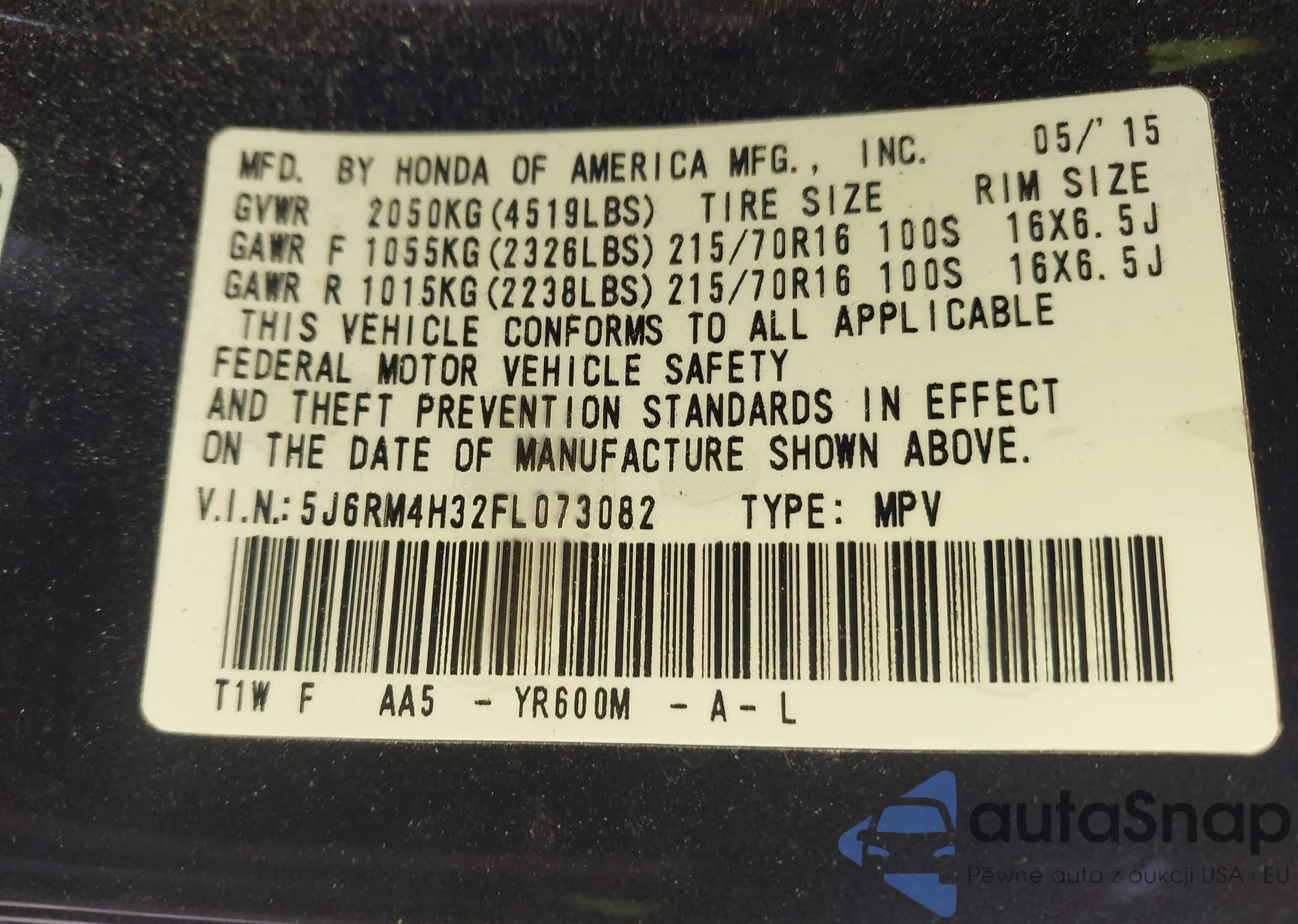 • VIN 5J6RM4H32FL073082