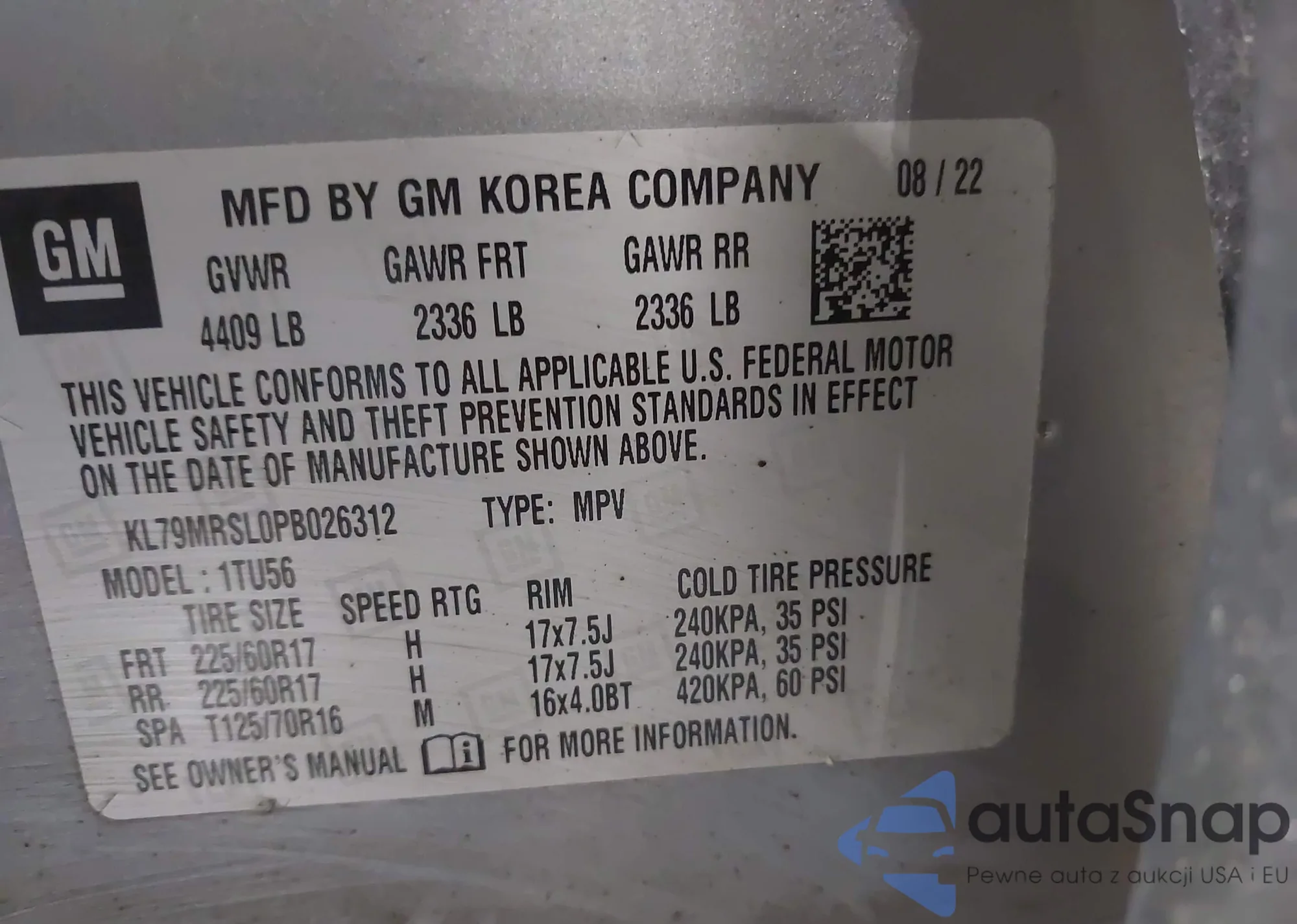 • VIN KL79MRSL0PB026312