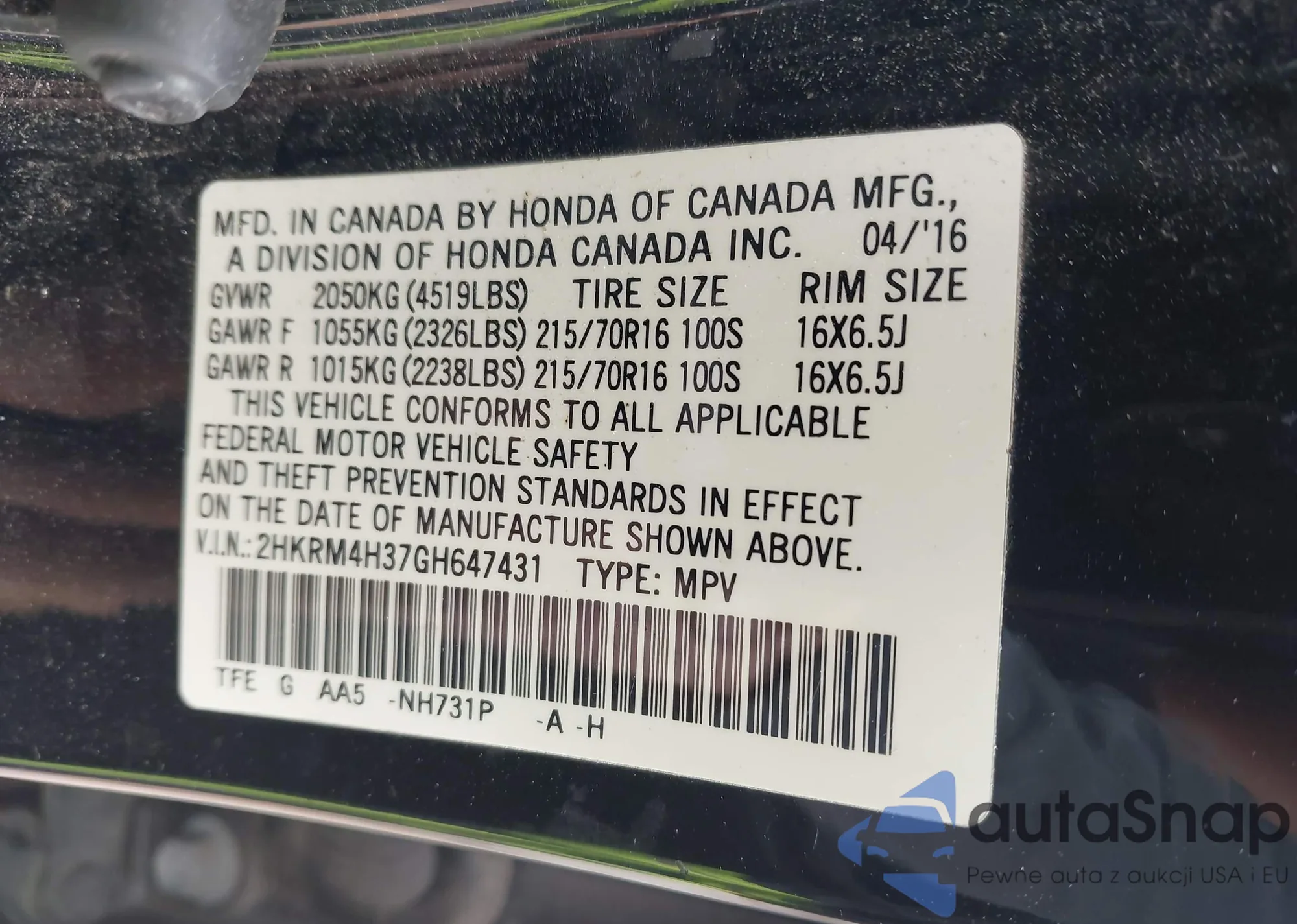 • VIN 5FNRL3H46AB066627