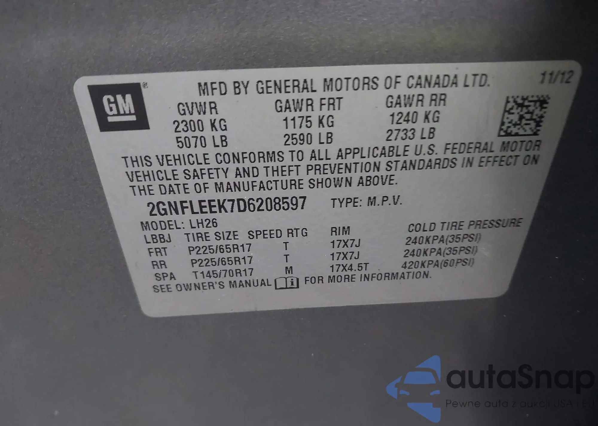 LOT: 43913068 VIN: 2GNFLEEK7D6208597