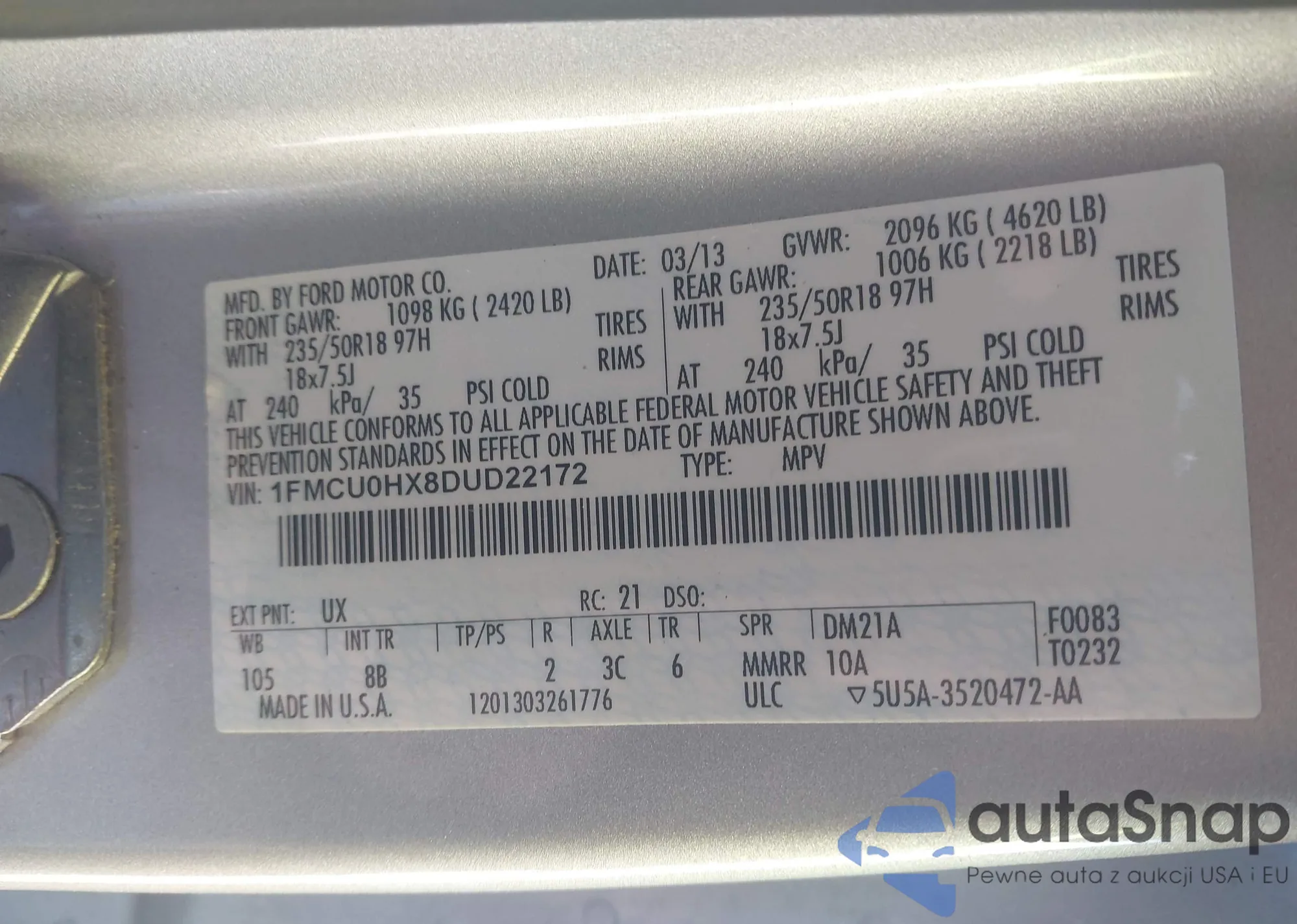 • VIN 1FMCU0HX8DUD22172
