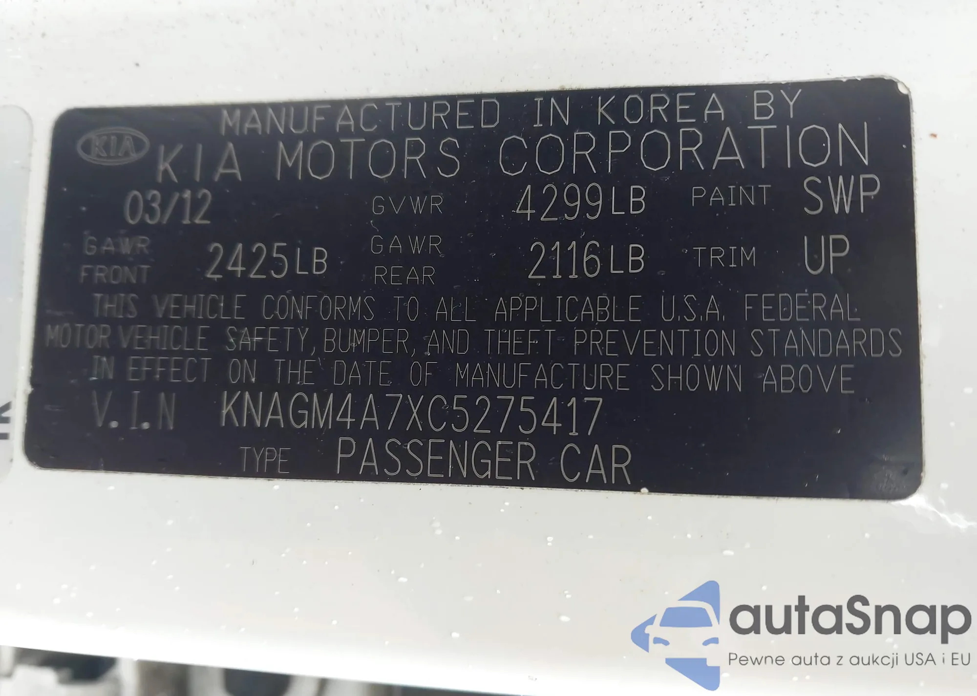 2012 Kia Optima Lx z USA, uszkodzony, nr VIN KNAGM4A7XC5275417