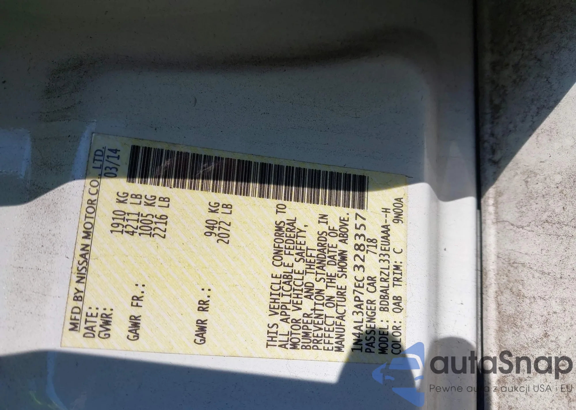 LOT: 43816007 VIN: 1N4AL3AP7EC328357