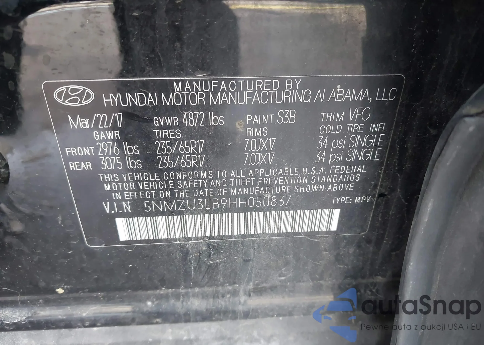 • VIN 5NMZU3LB9HH050837