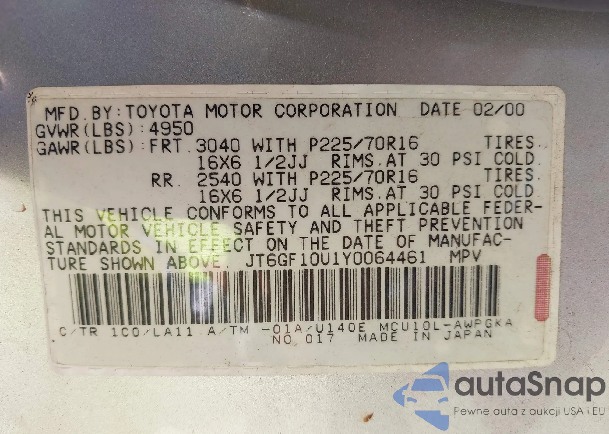• VIN JT6GF10U1Y0064461