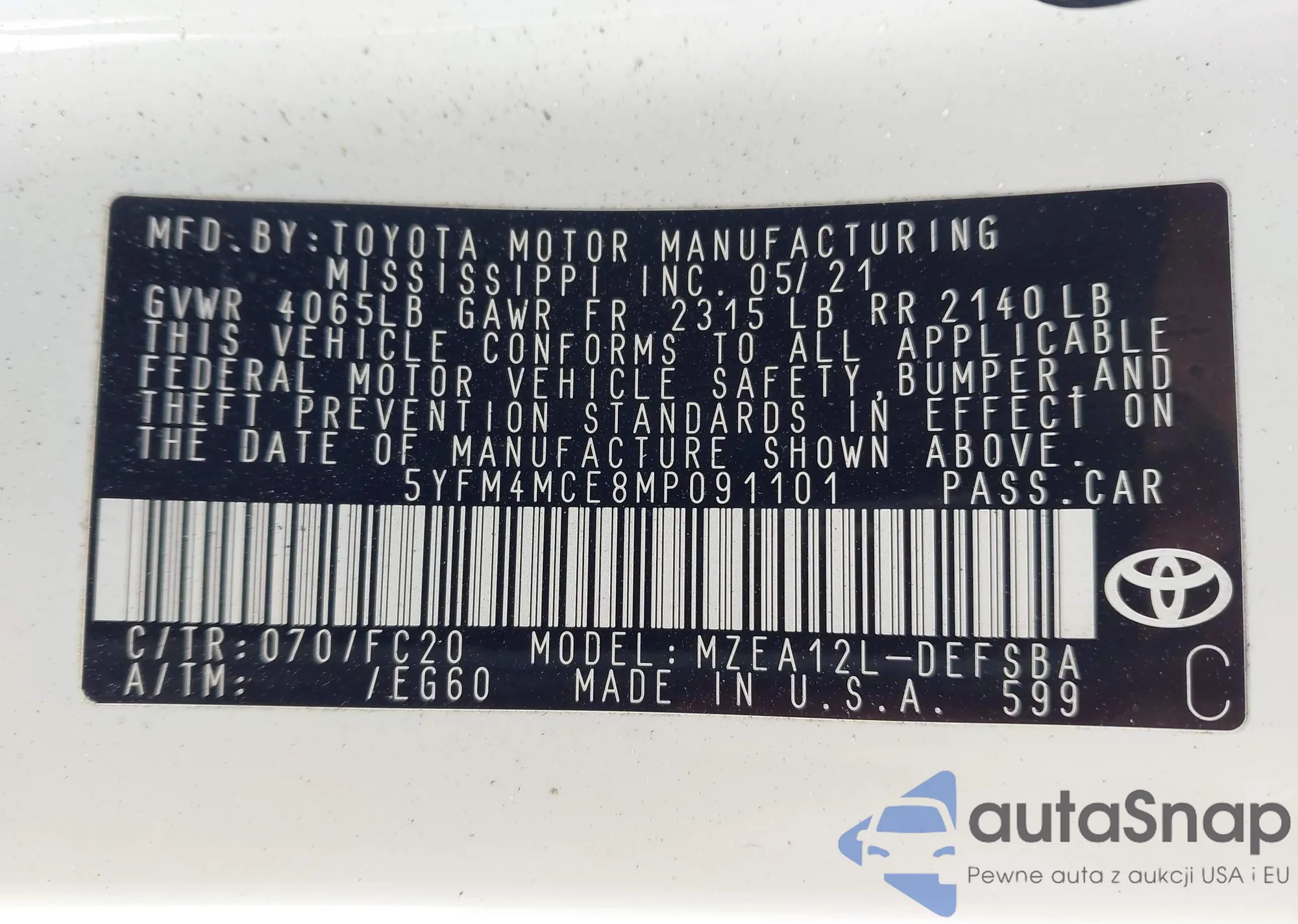 LOT: 43923680 VIN: 5YFM4MCE8MP091101