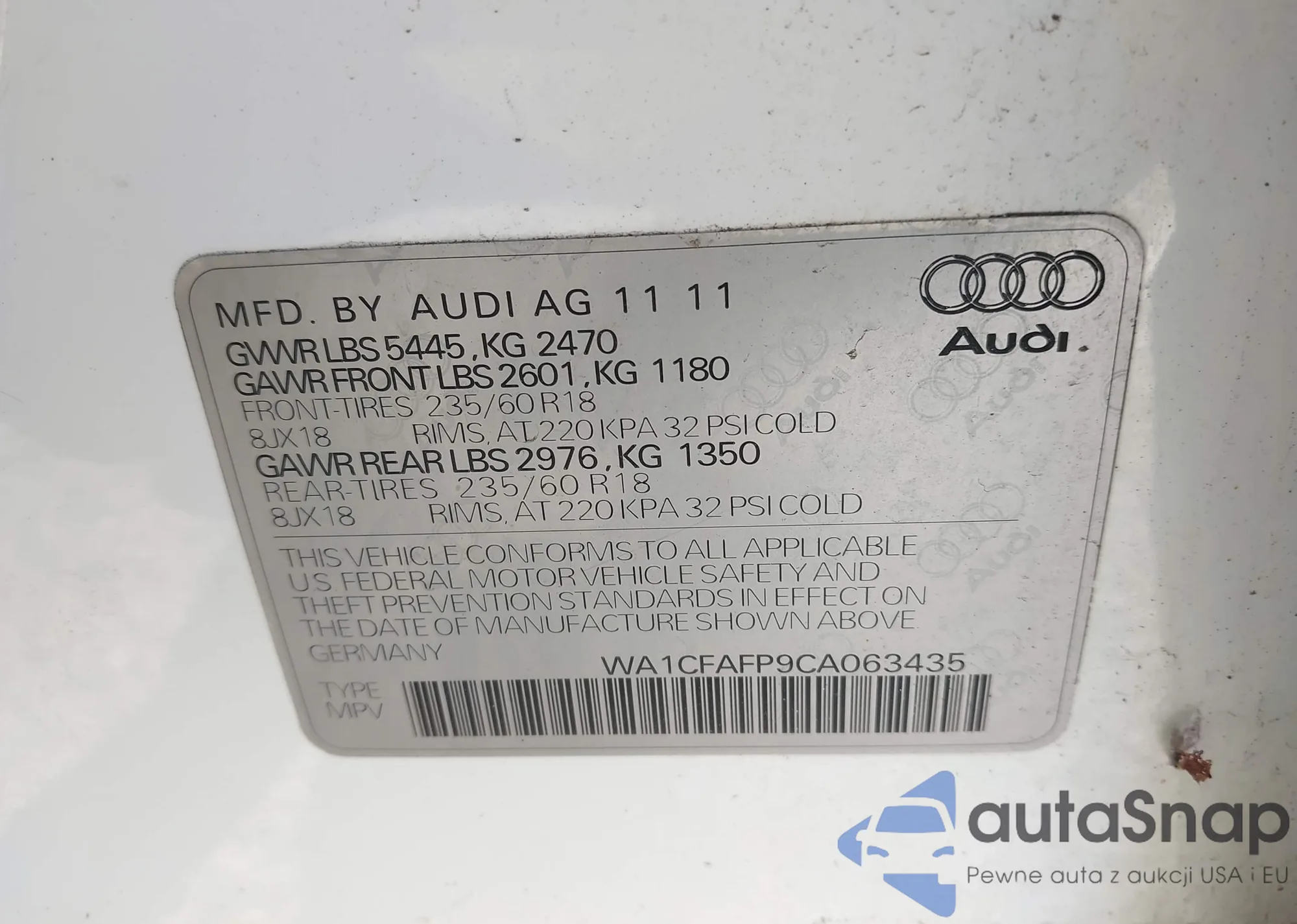 LOT: 43929362 VIN: WA1CFAFP9CA063435