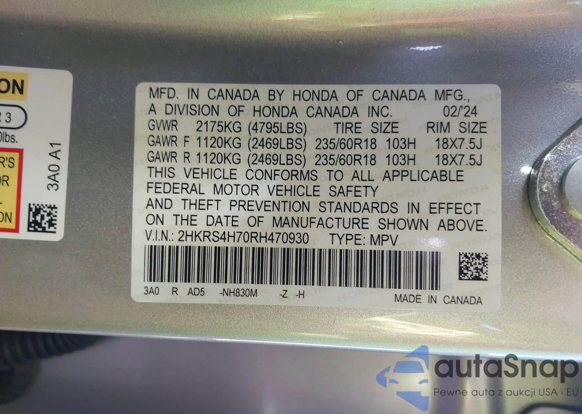 • VIN 2HKRS4H70RH470930