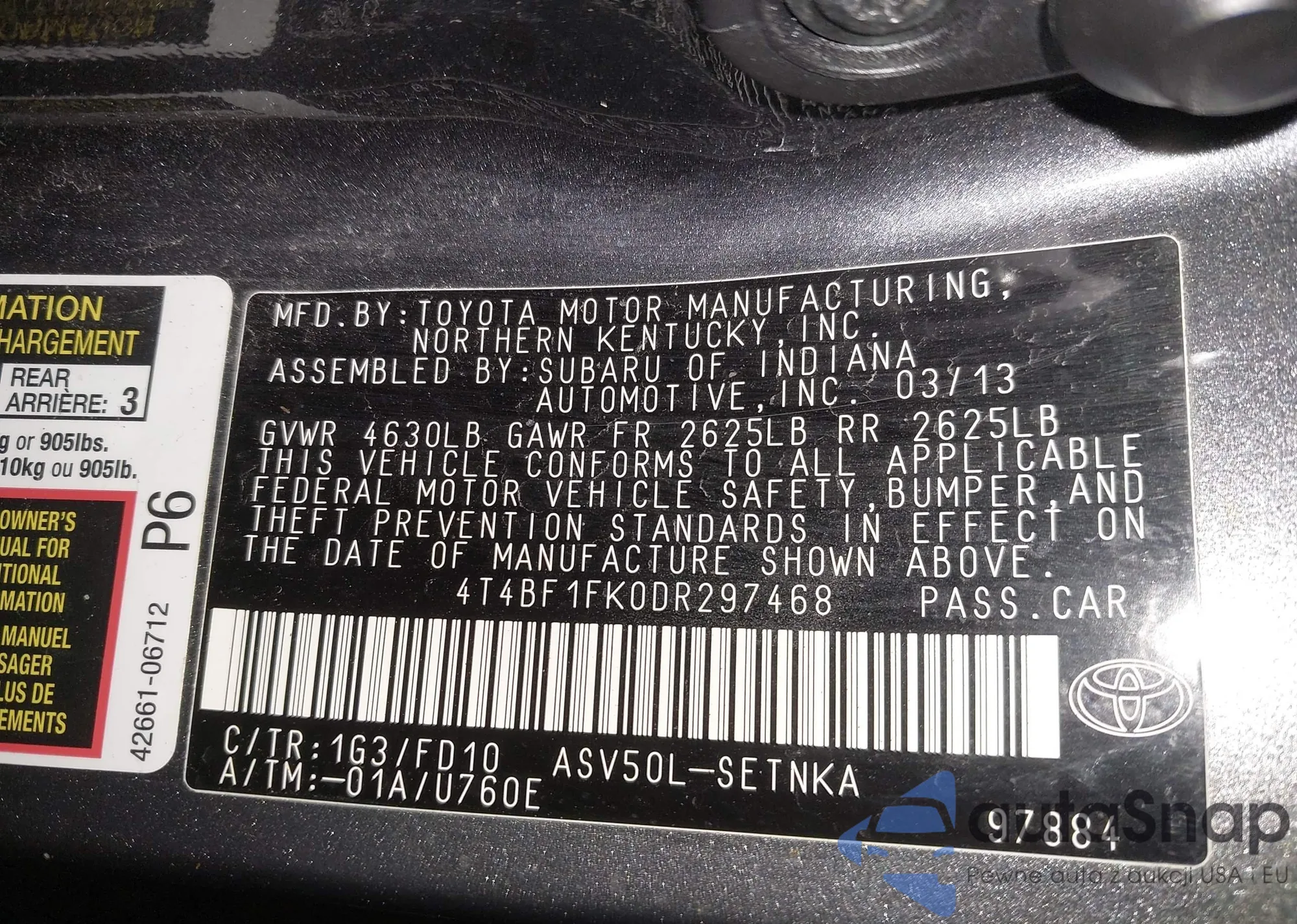 LOT: 43897223 VIN: 4T1BF3EK8AU069124