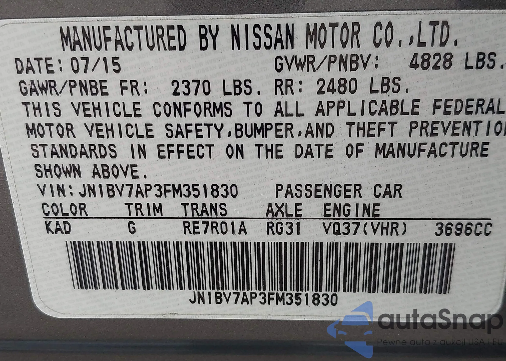 LOT: 43726760 VIN: JN1BV7AP3FM351830
