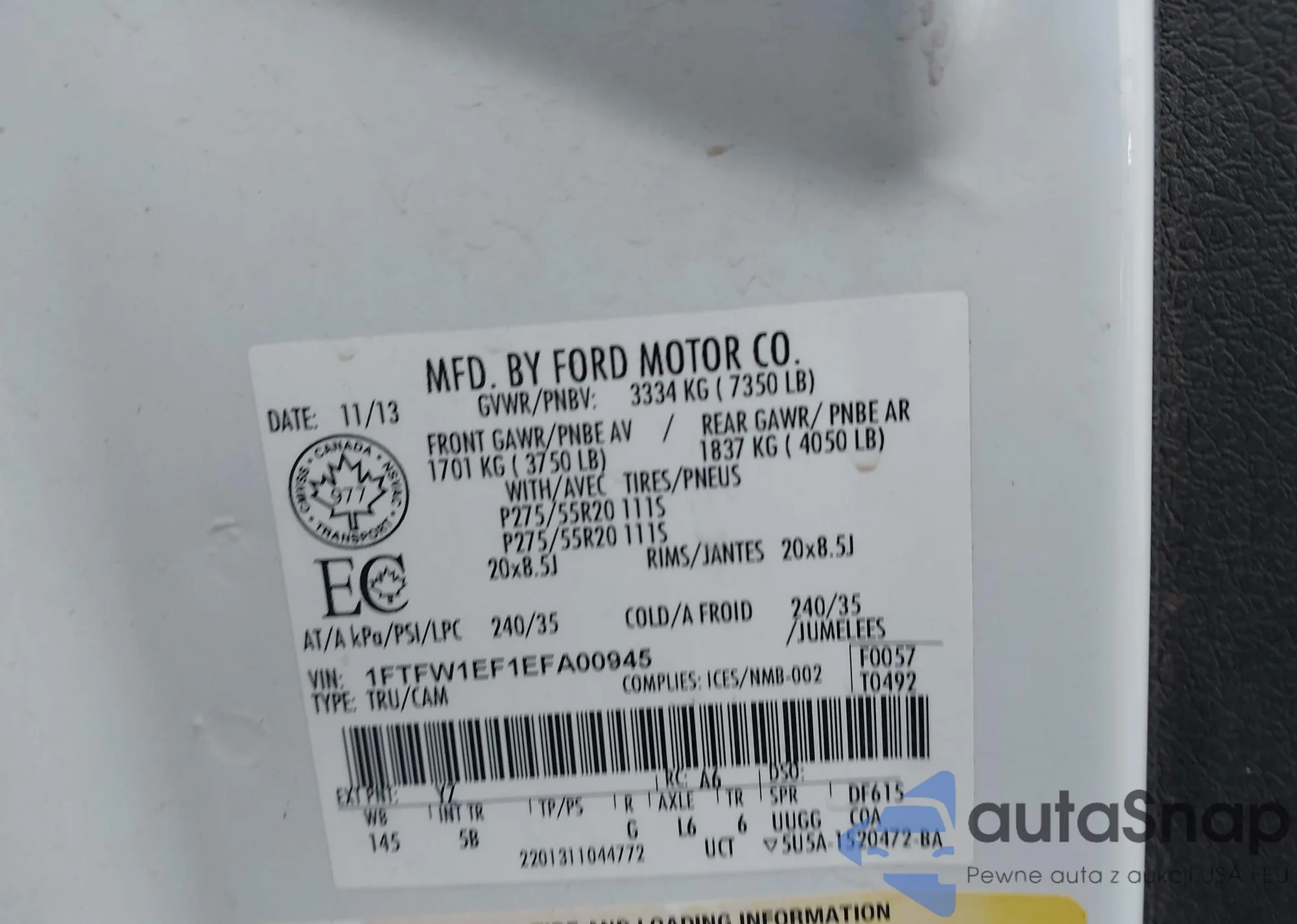2013 Ford F-150 Fx4 z USA, uszkodzony, nr VIN 1FTFW1EF8DFA96040