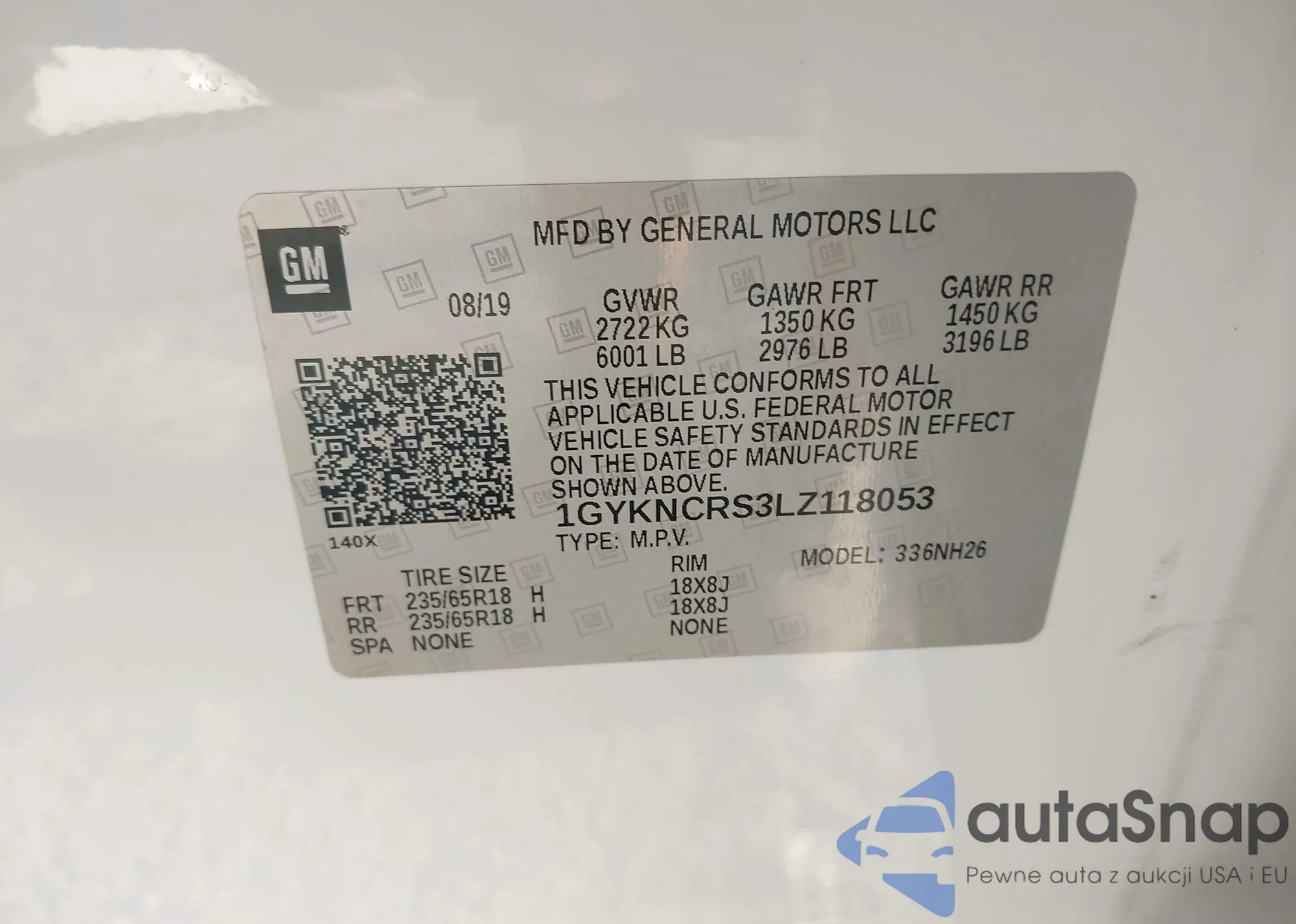 LOT: 43750829 VIN: 1GYKNCRS3LZ118053
