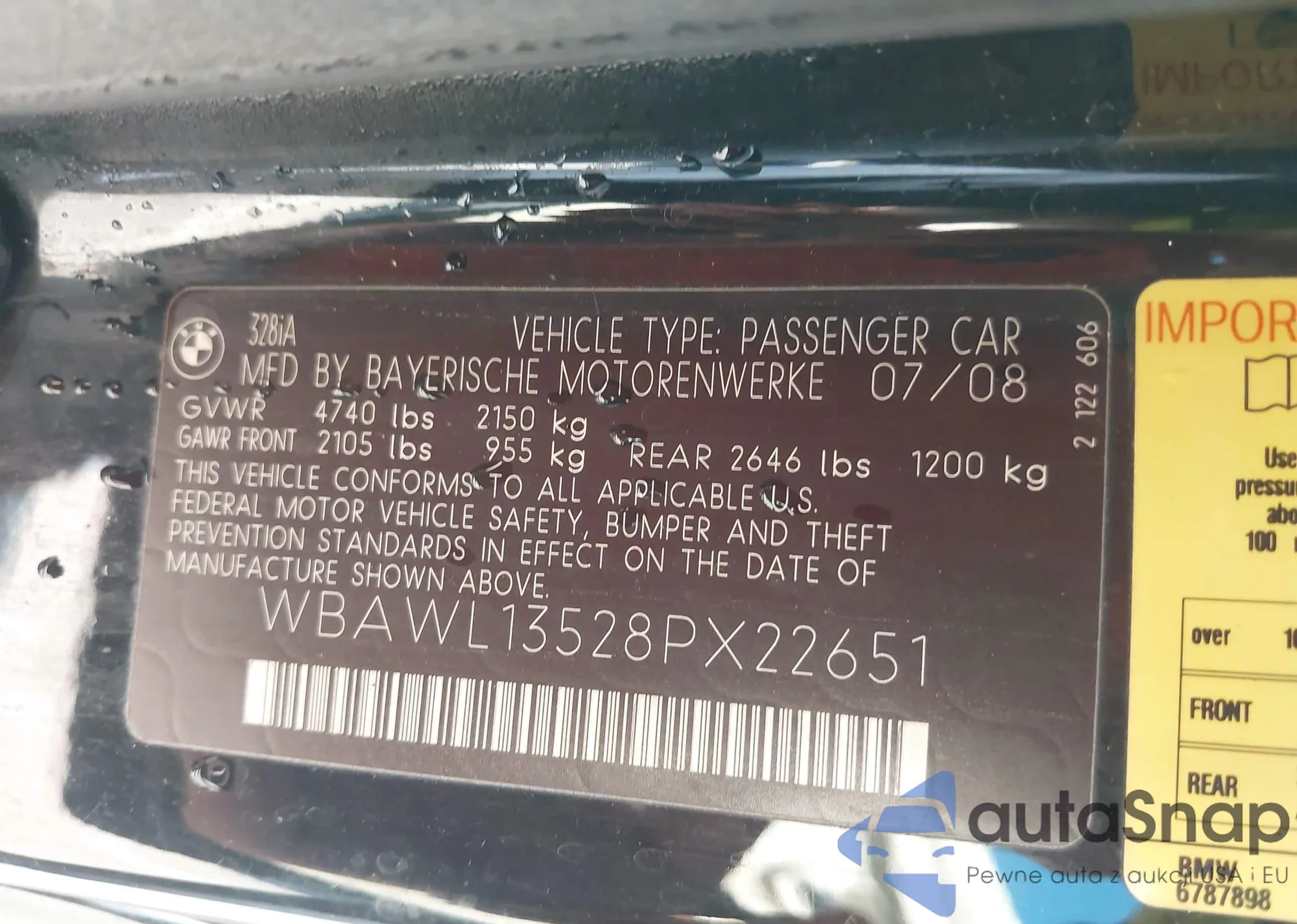 2008 BMW 328I z USA, uszkodzony, nr VIN WBAWL13528PX22651