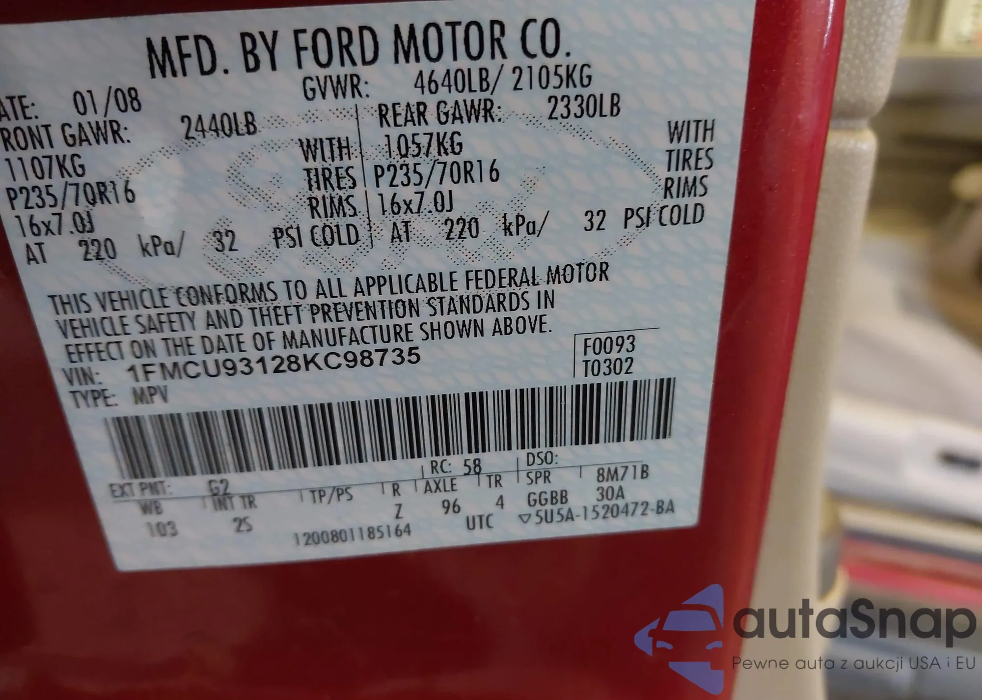LOT: 44033092 VIN: 1FMCU93128KC98735