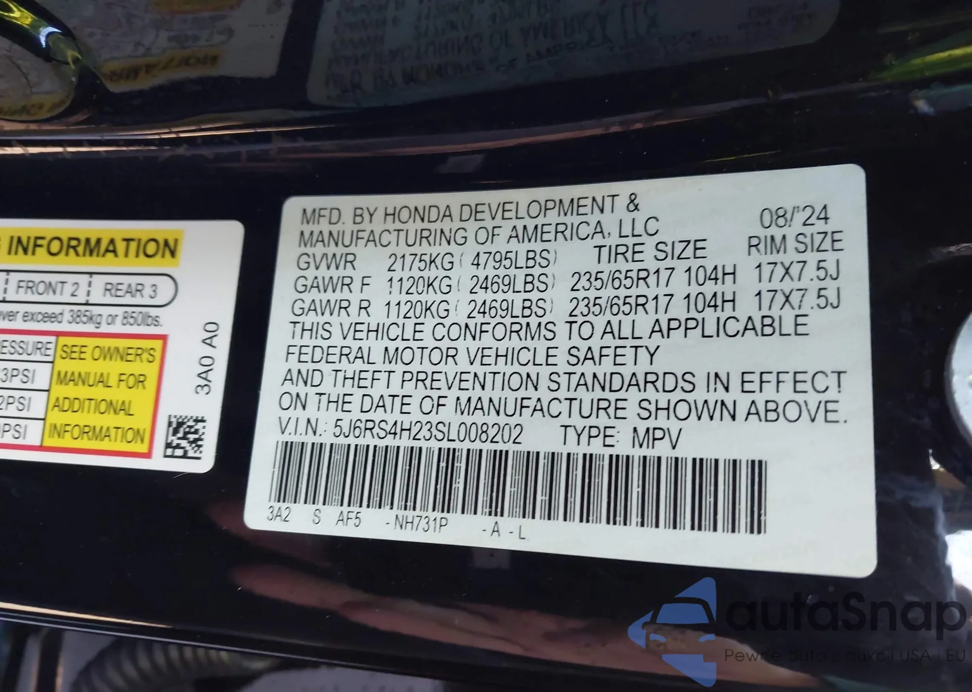 • VIN 5J6RS4H23SL008202