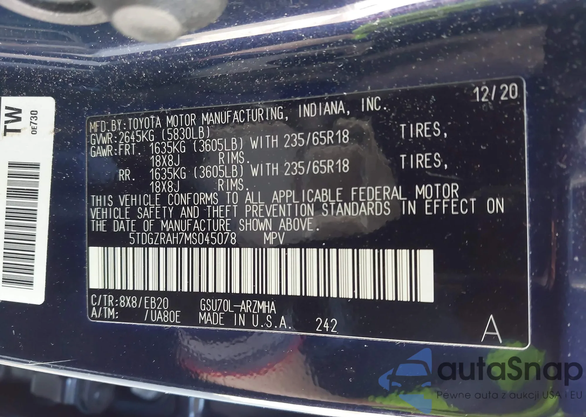 LOT: 43272538 VIN: 5TDGZRAH7MS045078