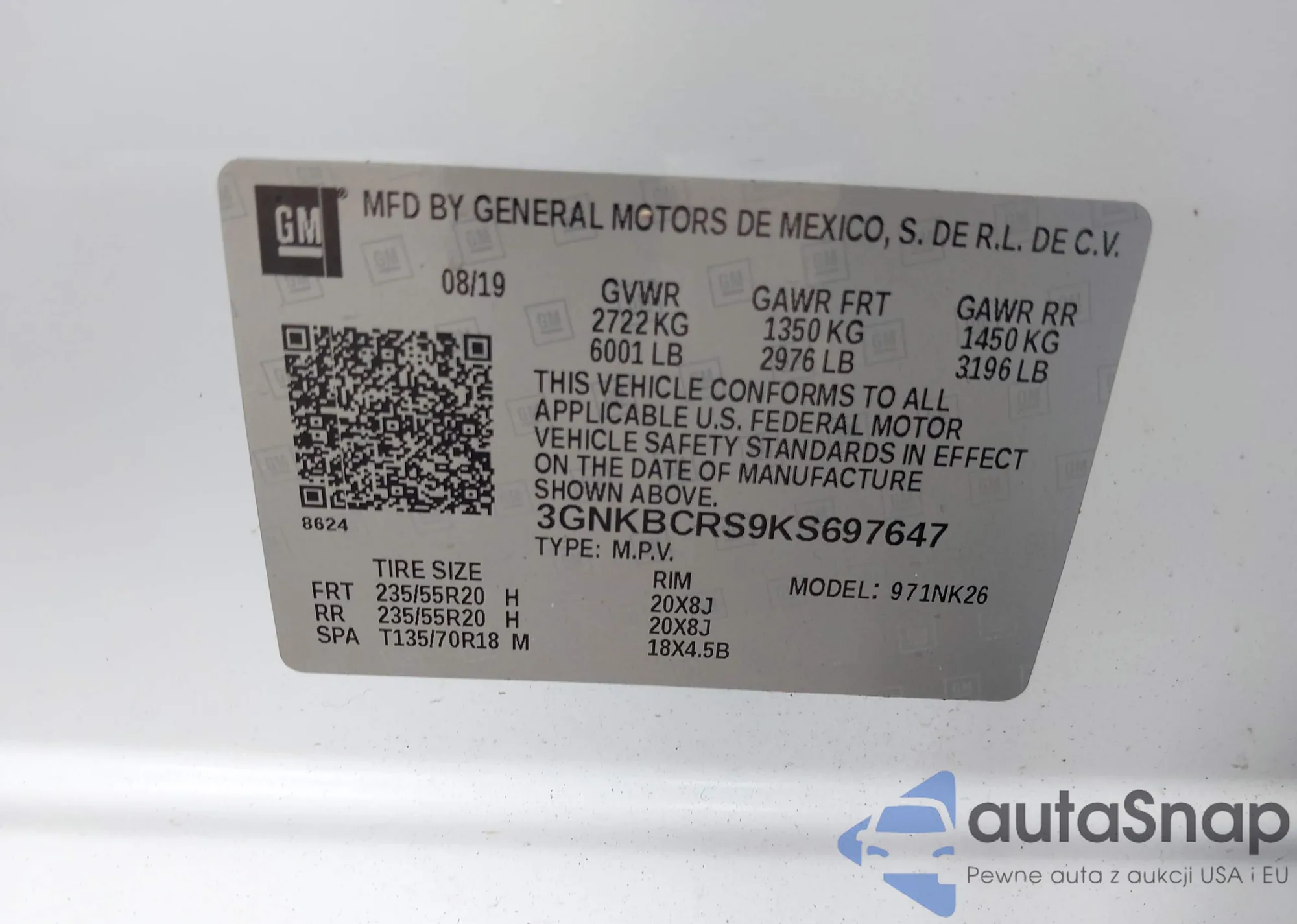 LOT: 43378112 VIN: 3GNKBCRS9KS697647