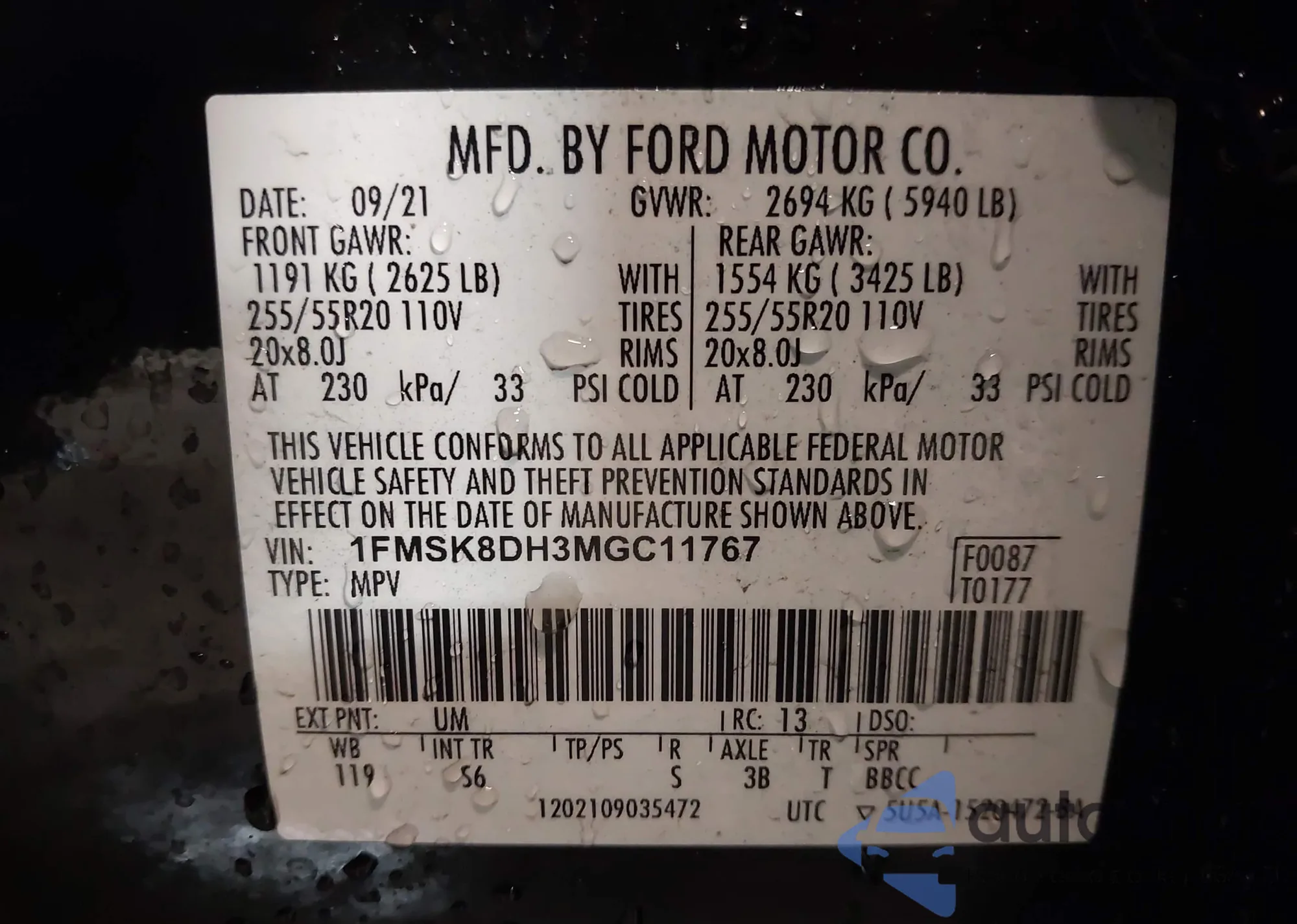 • VIN 1FMSK8DH3MGC11767