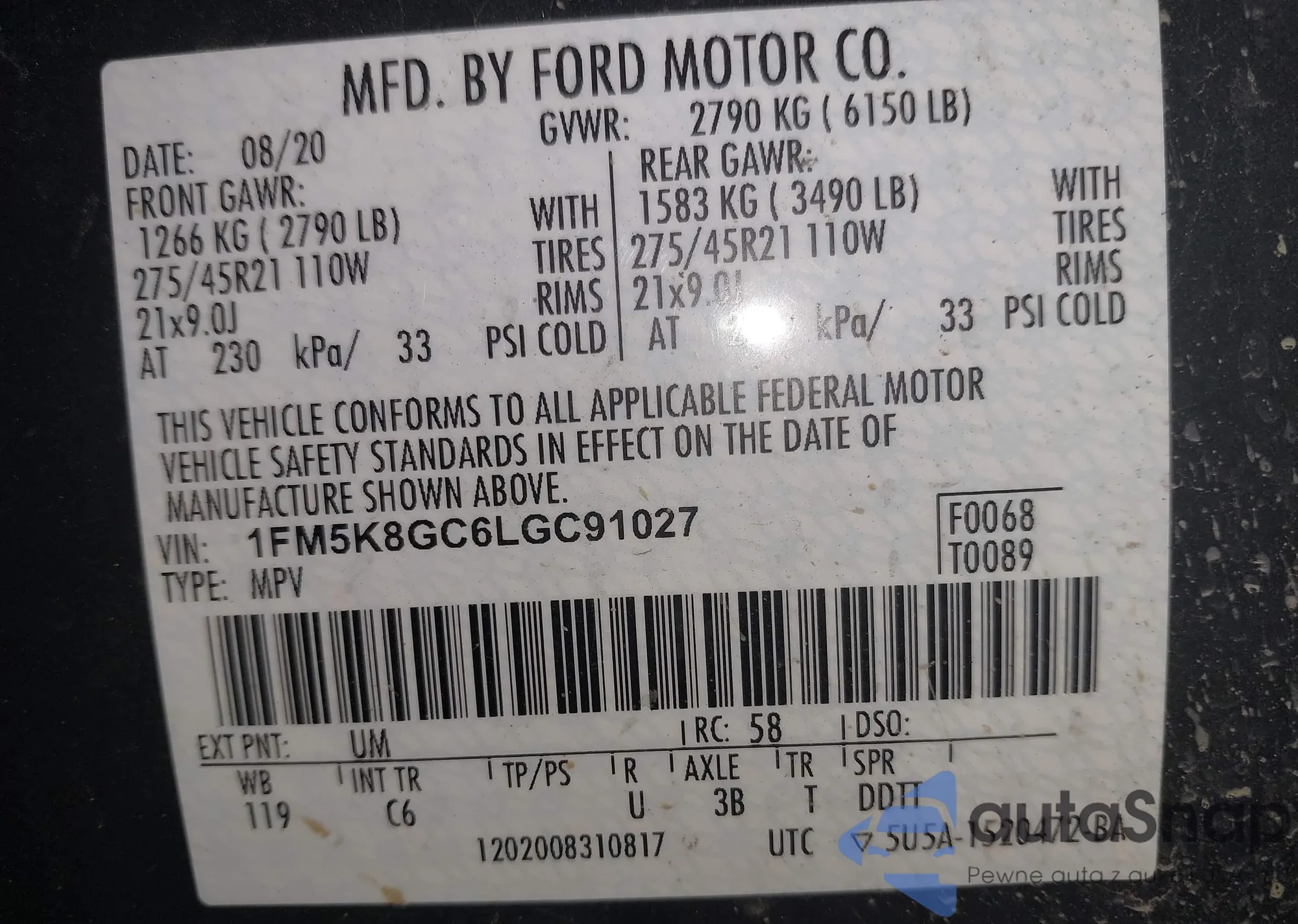 LOT: 43663708 VIN: 1FM5K8GC6LGC91027