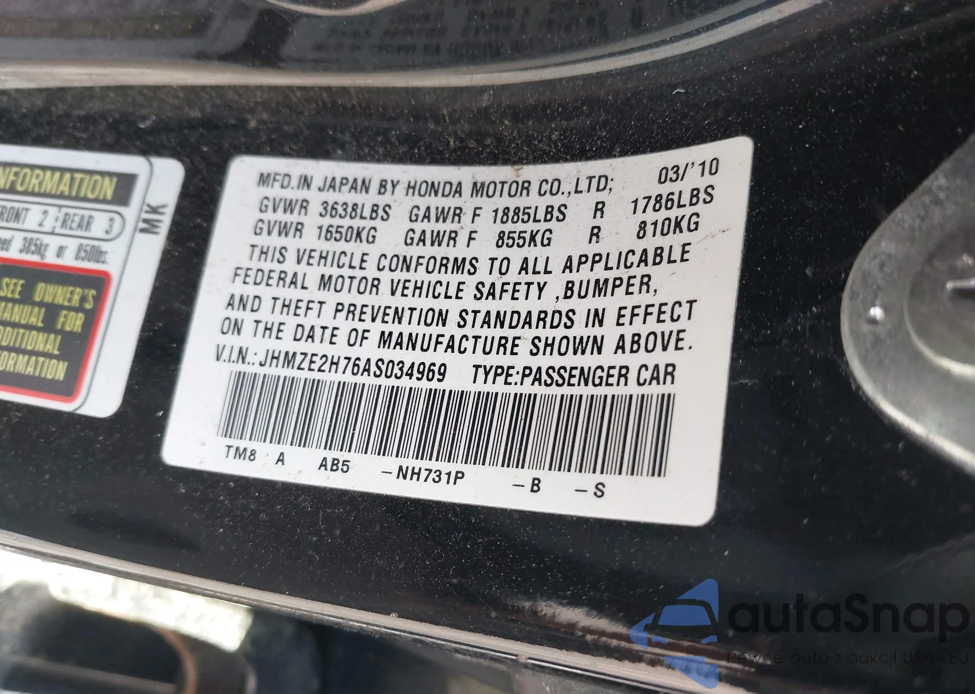 LOT: 42264976 VIN: JHMZE2H76AS034969