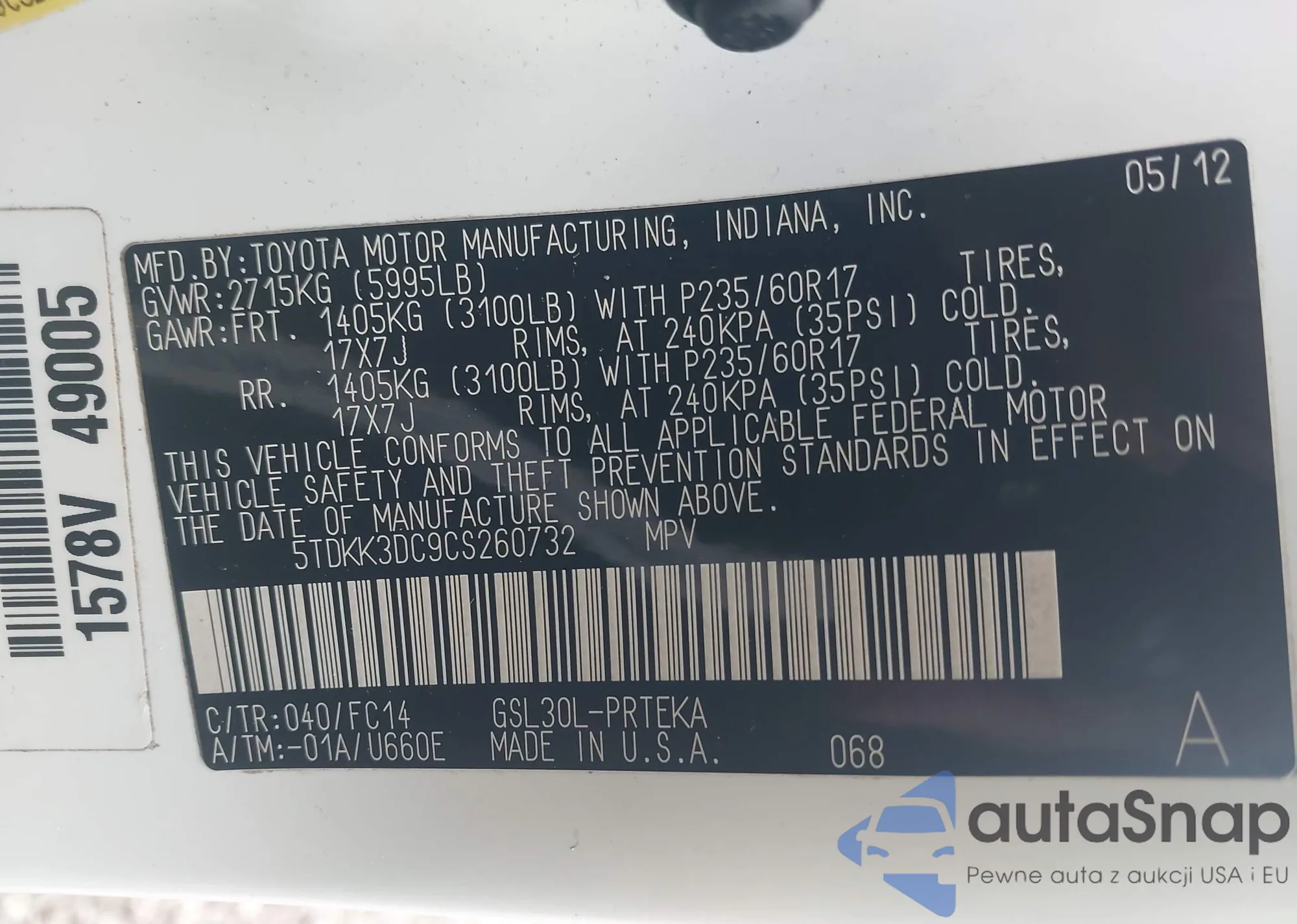 LOT: 44007523 VIN: 5TDKK3DC9CS260732