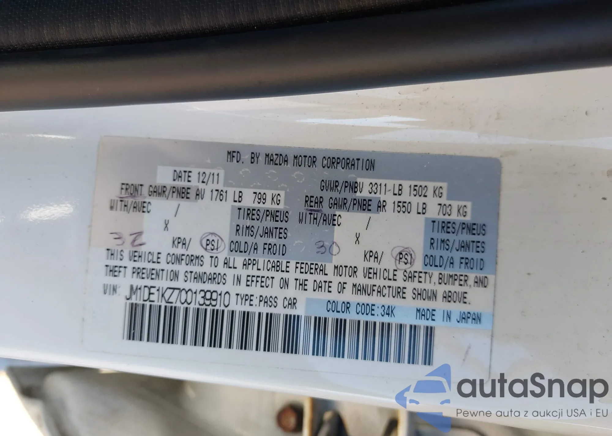 LOT: 43971326 VIN: JM1DE1KZ7C0139910